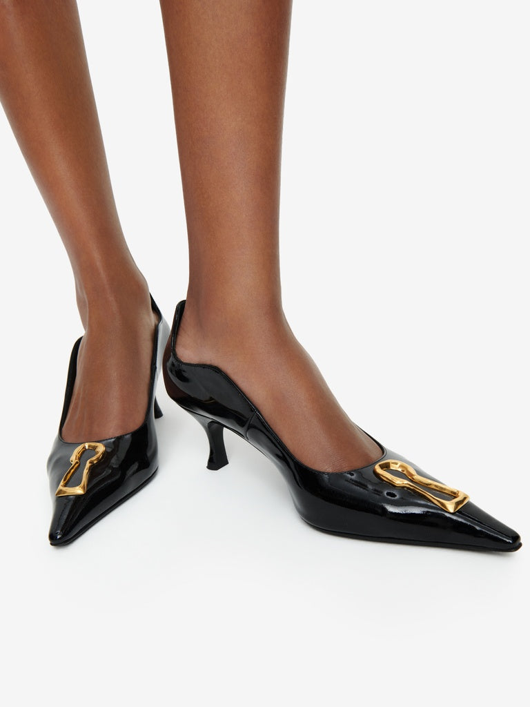 This pointed-toe pump in smooth patent leather, with a leather lining, is embellished with the signature gold lock detail, an iconic code of the Maison.