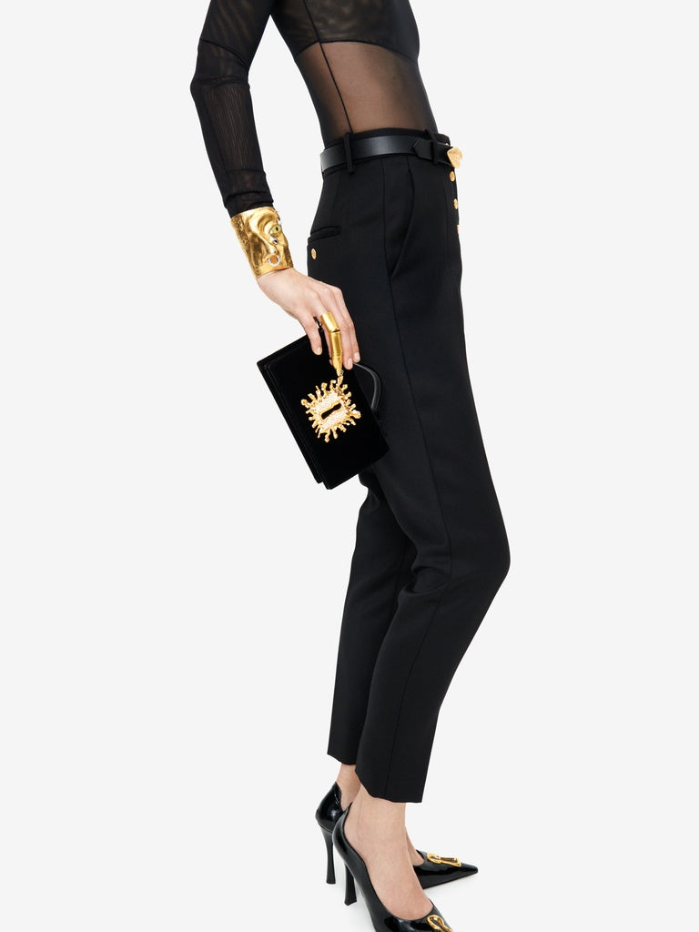 This black velvet pouch, enhanced with a signature Trou de Serrure jewel plaque in brass and rhinestones and a gold-tone metal link chain, pays homage to one of the Maison's key codes.