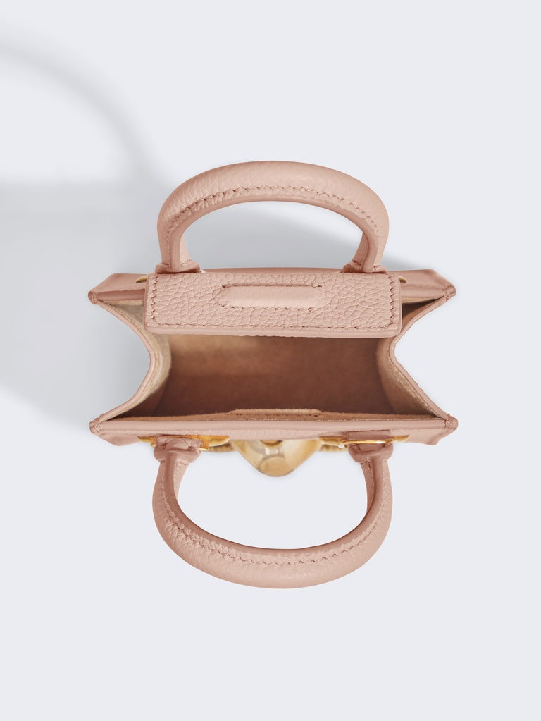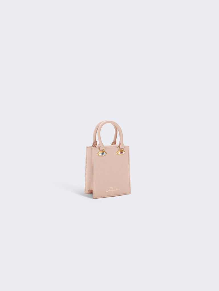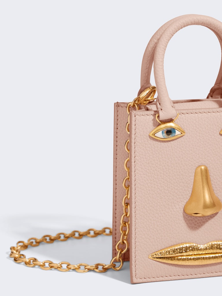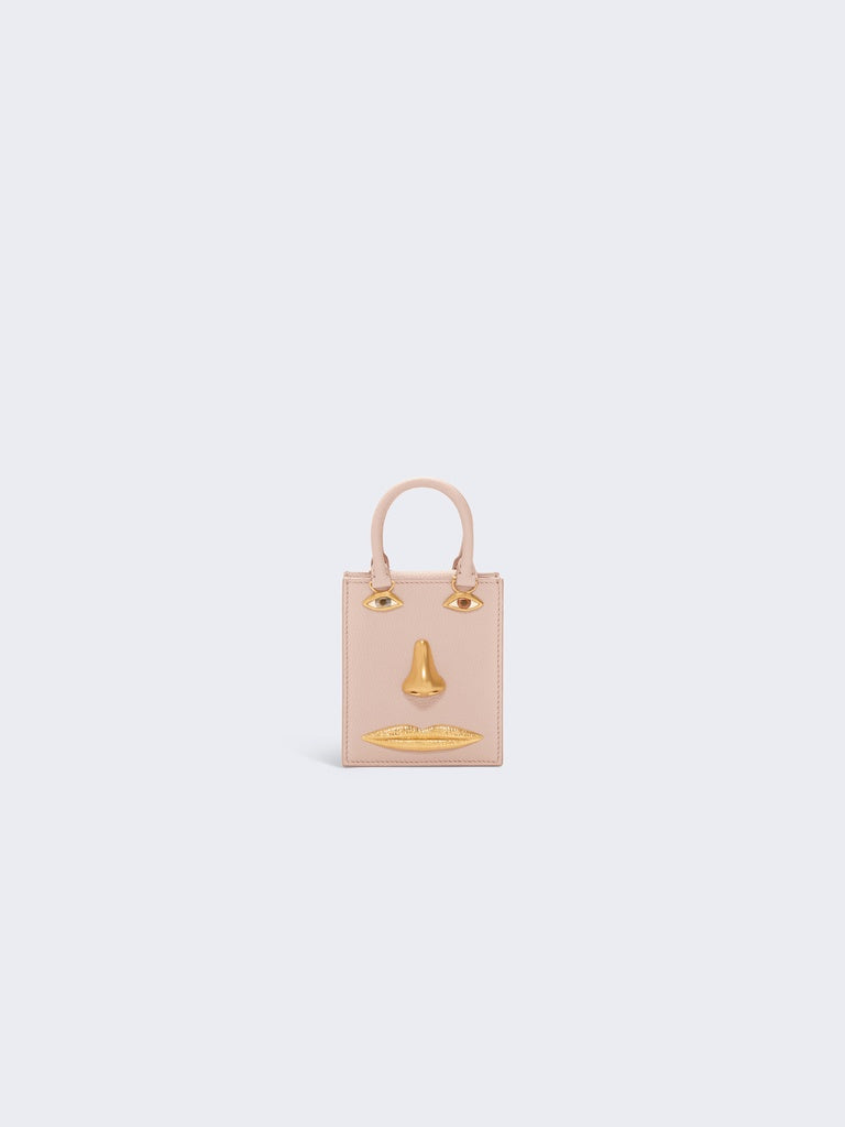 This micro Face bag is crafted from blush grained calfskin leather. It is decorated with signature anatomical jewels in hammered gold-plated brass forming a trompe-l'oeil face.
