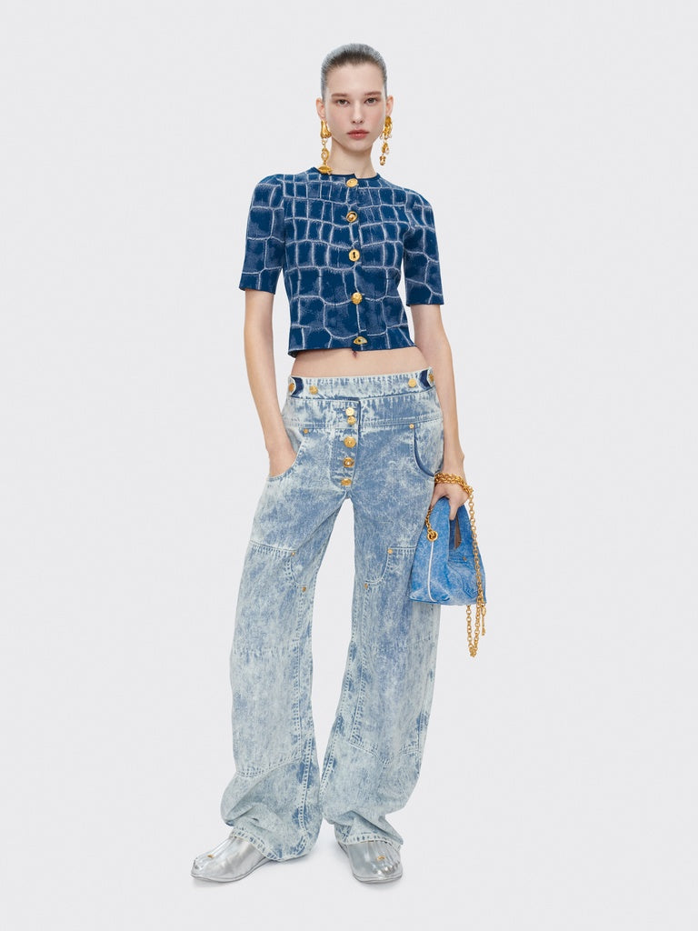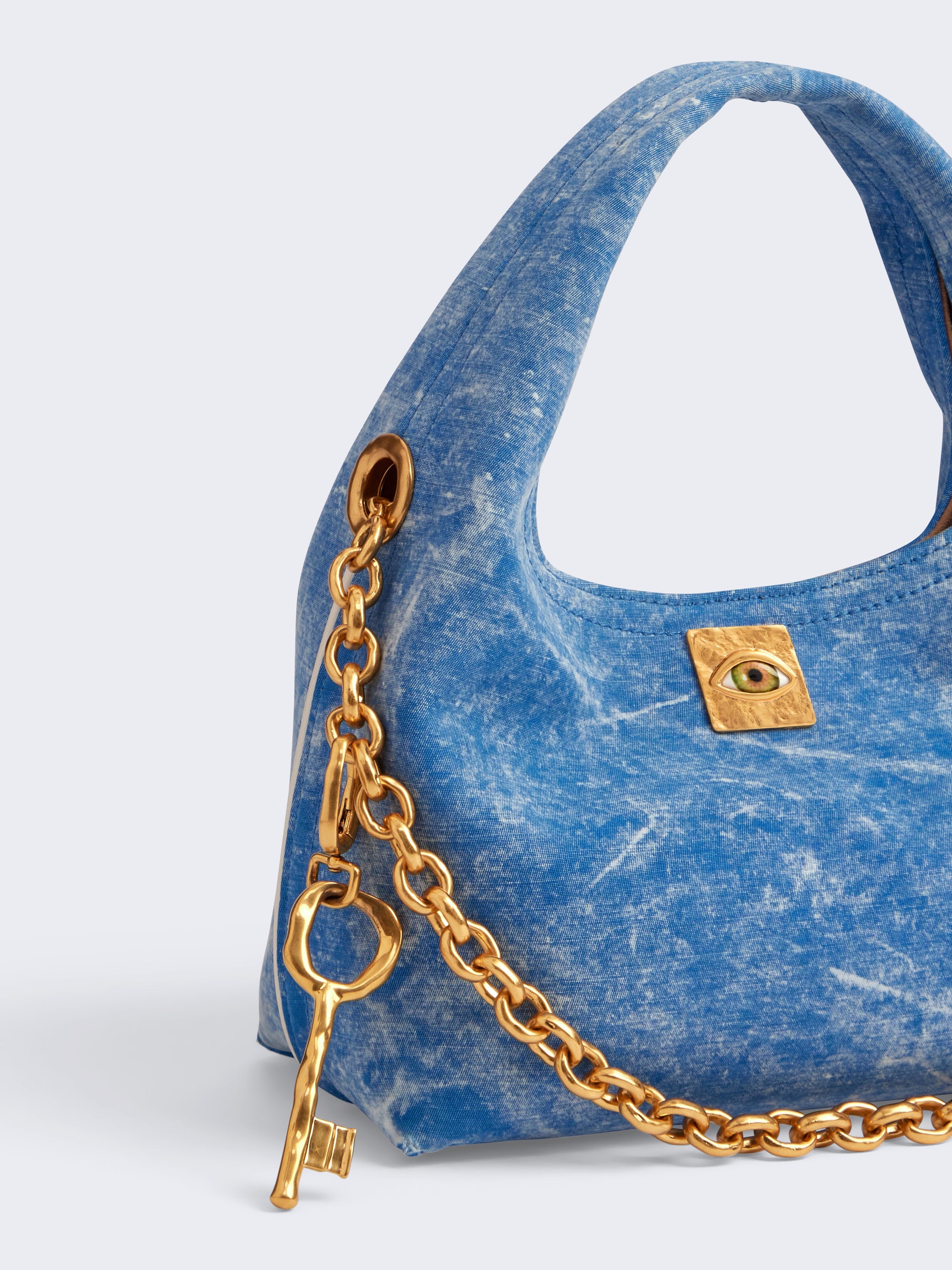 This mini Soufflé bag has been made from a heavy cotton that has been overdyed and faded in blue, dubbed ‘the perfect cotton’ by our Artistic Director Daniel Roseberry.