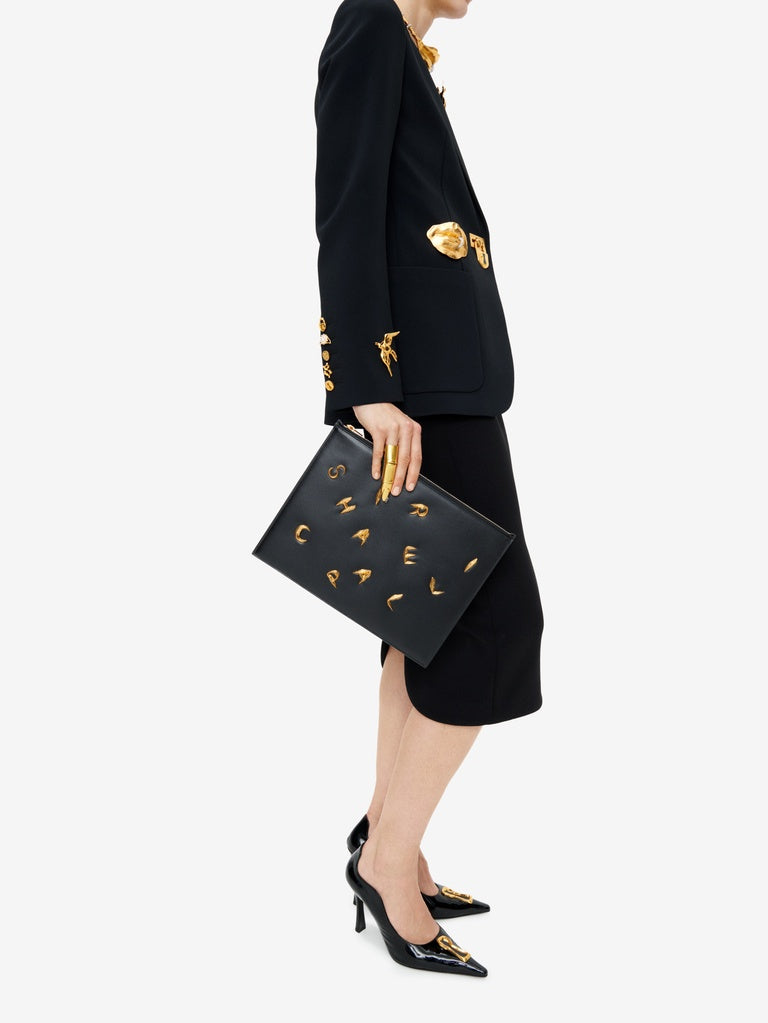 A zipped pouch is made of smooth black calfskin leather and is adorned with the Schiaparelli letters in hammered gilt brass.