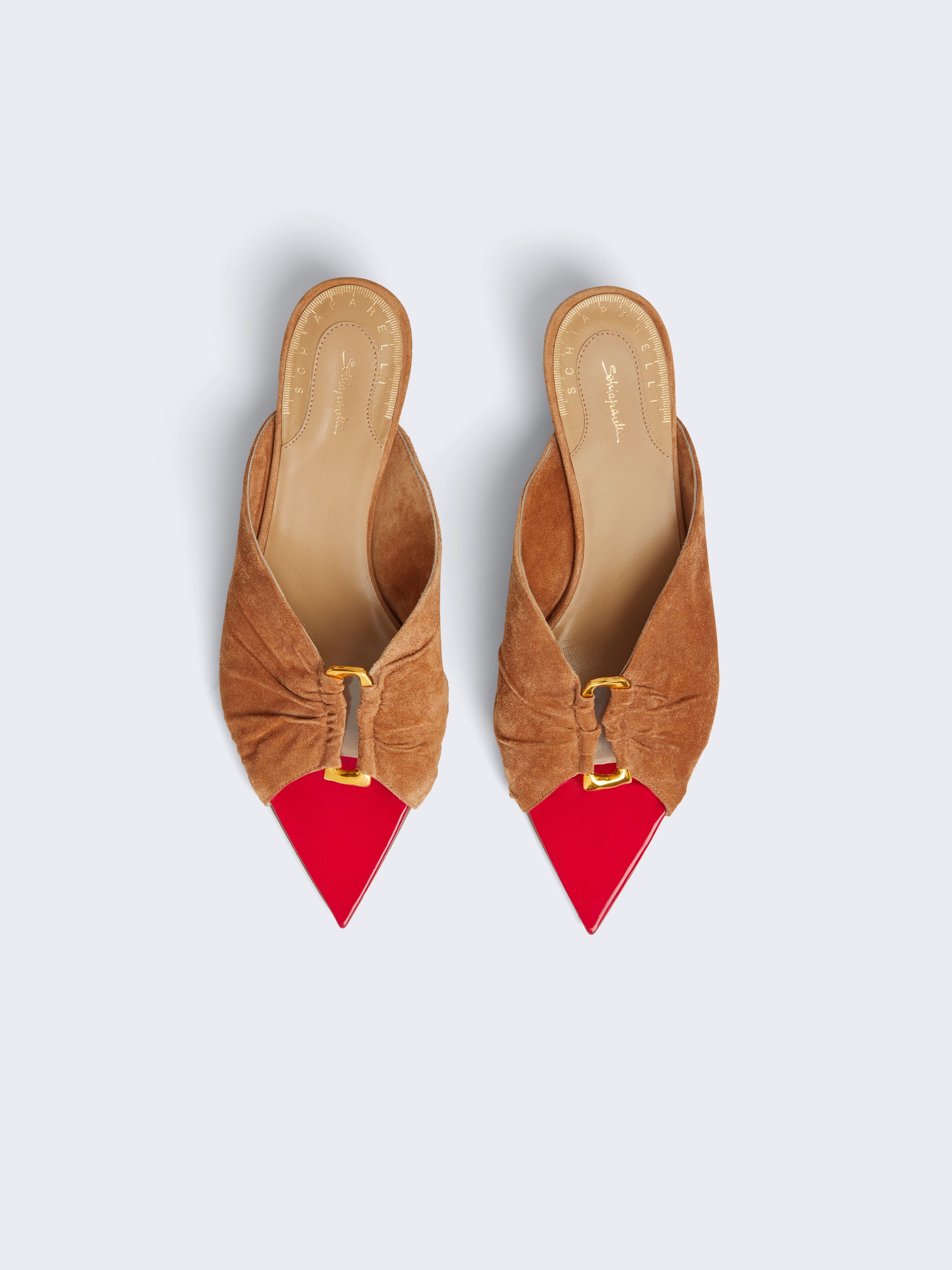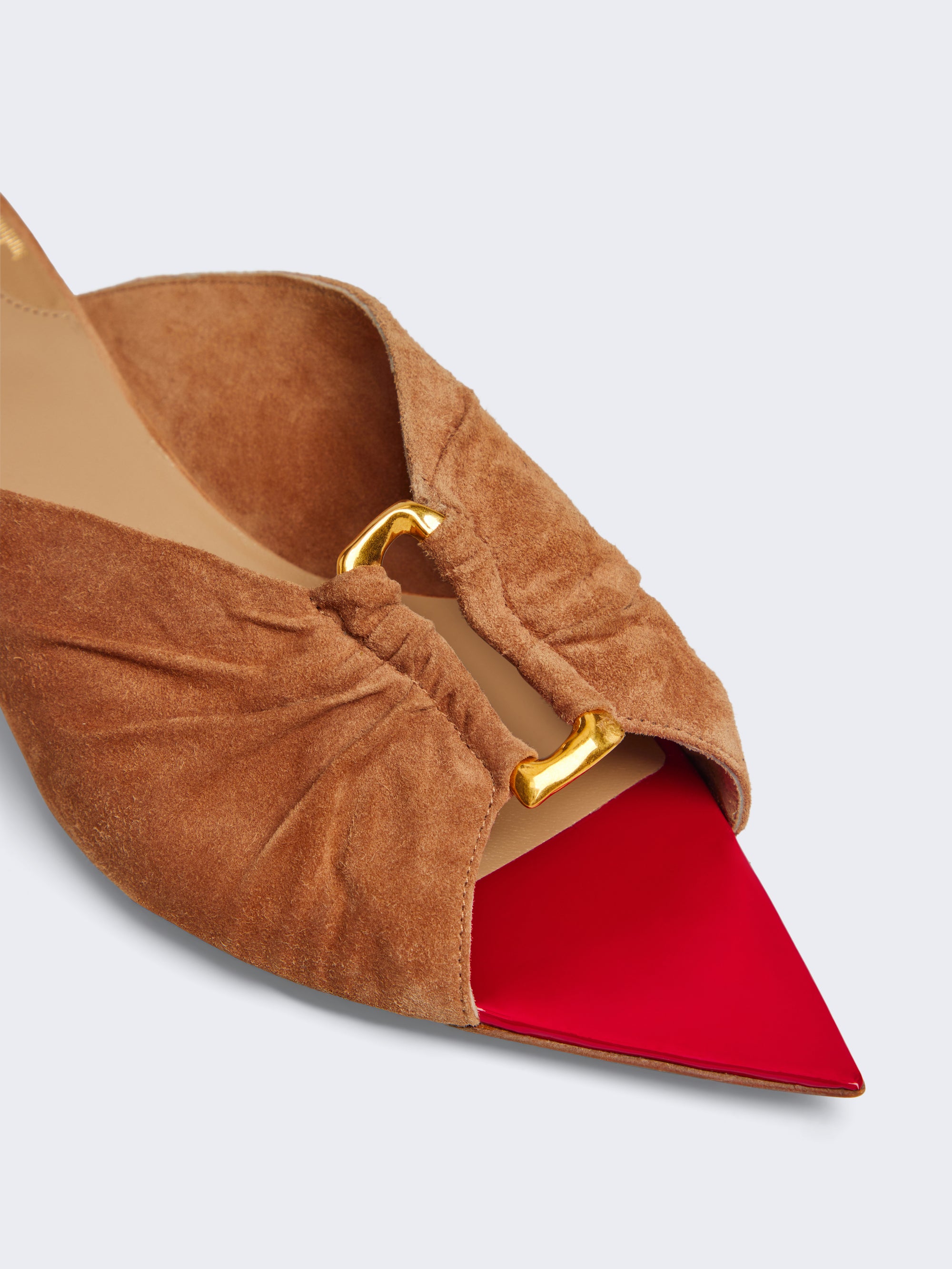 Taupe suede sandals embellished with a gold Keyhole jewel in the center and a small heel reminiscent of the sun.
