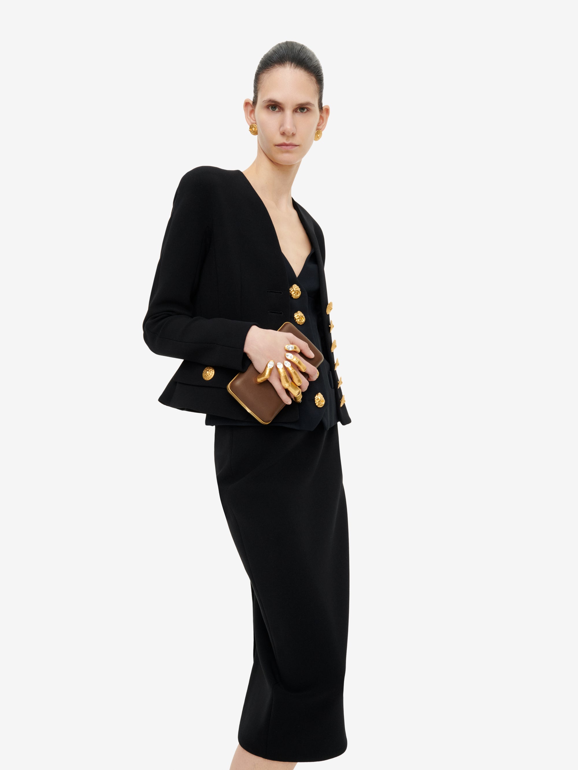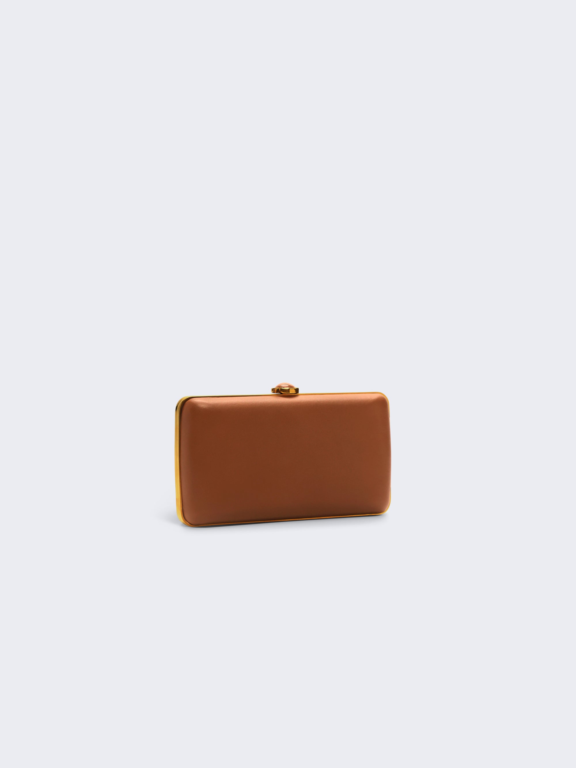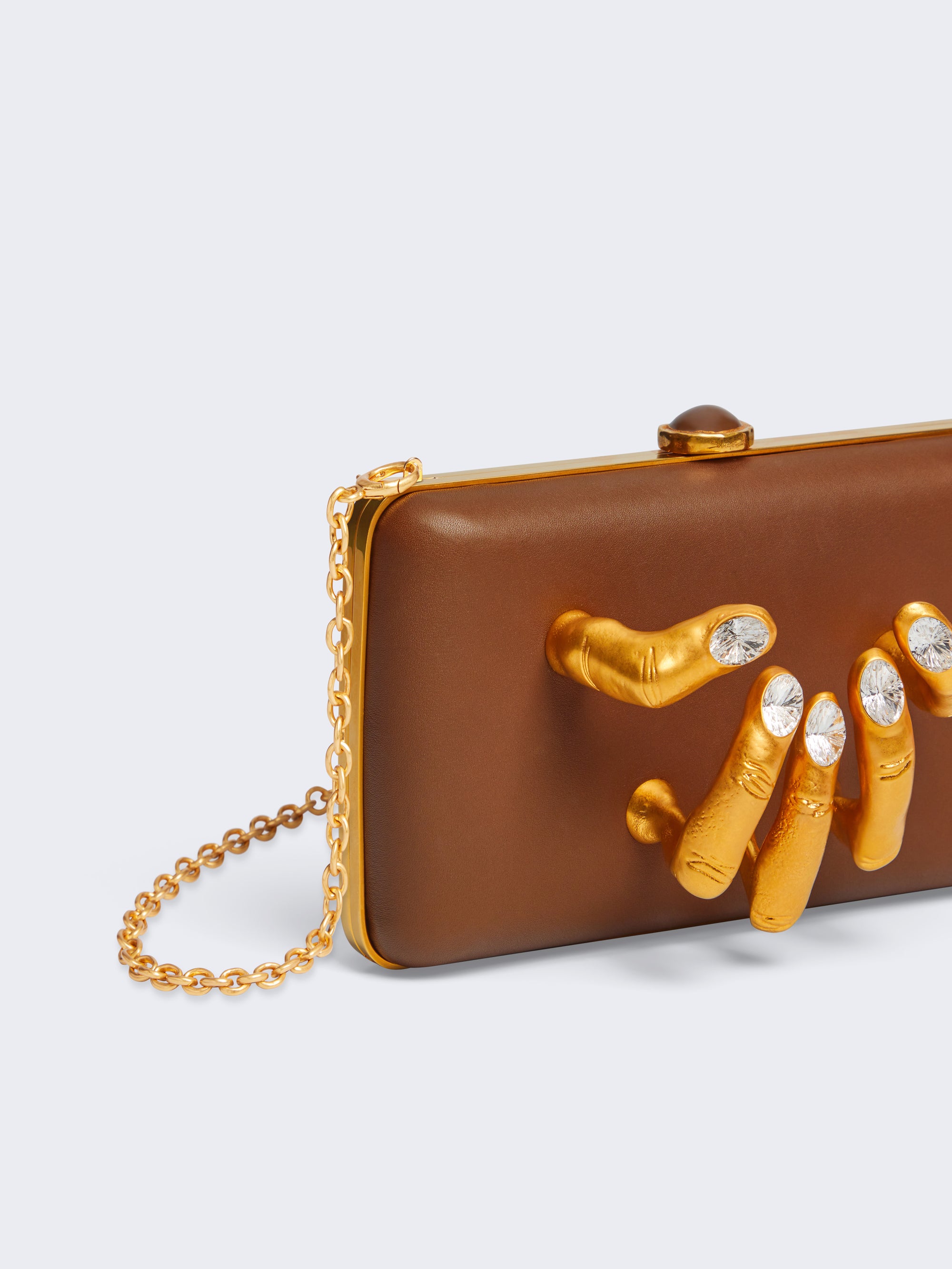 This “hand in hand” clutch bag is made from taupe calf leather. It is embellished with a gold metal hand with rhinestones on the nails that intertwines the fingers.