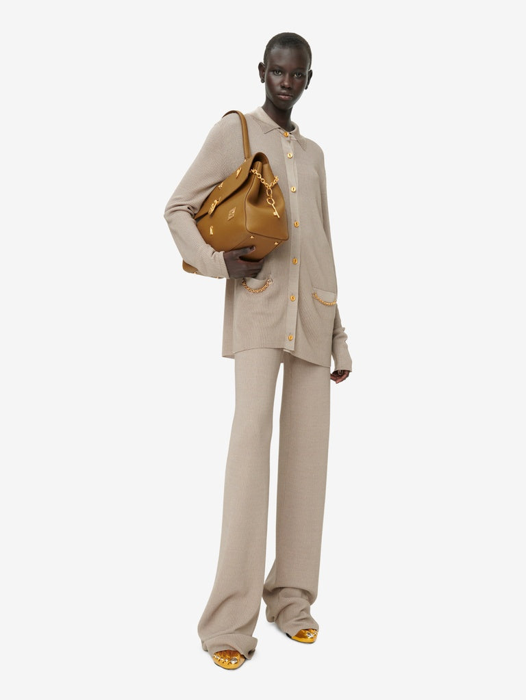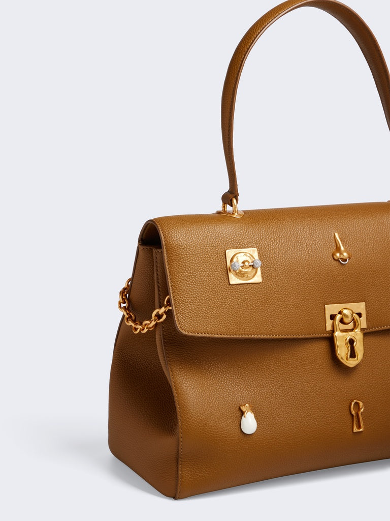 This bijoux soft Secret bag is crafted from olive grained calfskin. It is embellished with bijoux buttons featuring the Maison's iconic codes, a Padlock clasp, decorative chains signature charm Key in gold metal.