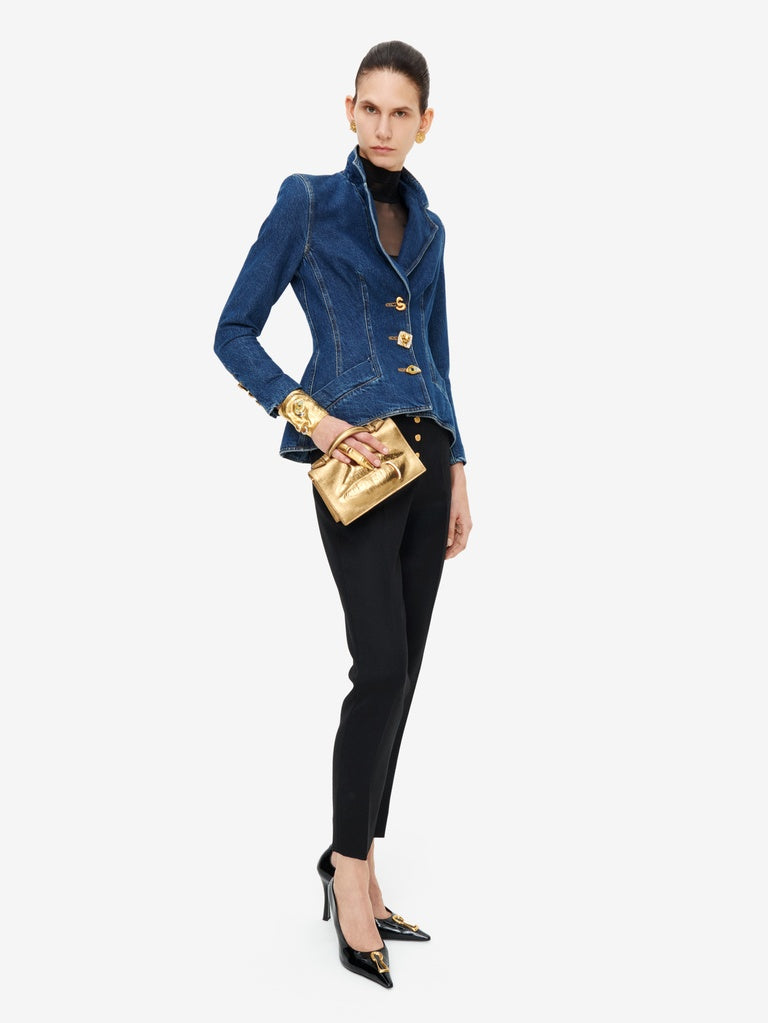 This bronze laminated calfskin clutch bag is encrusted with a moulded mouth embellished with a rhinestone piercing and a gold metal chain.