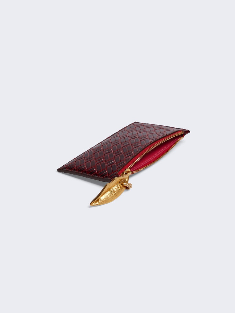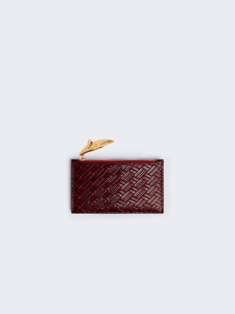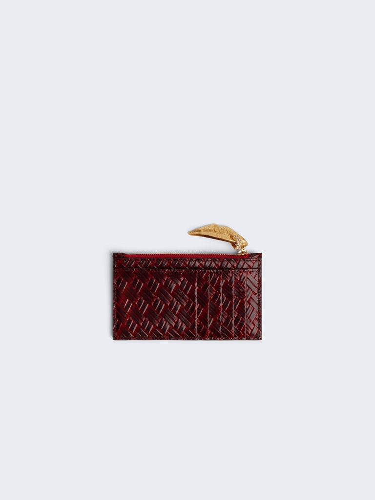 This red calfskin cardholder with trompe l'oeil woven effect is enhanced with a zip and signature gold metal zip pull.