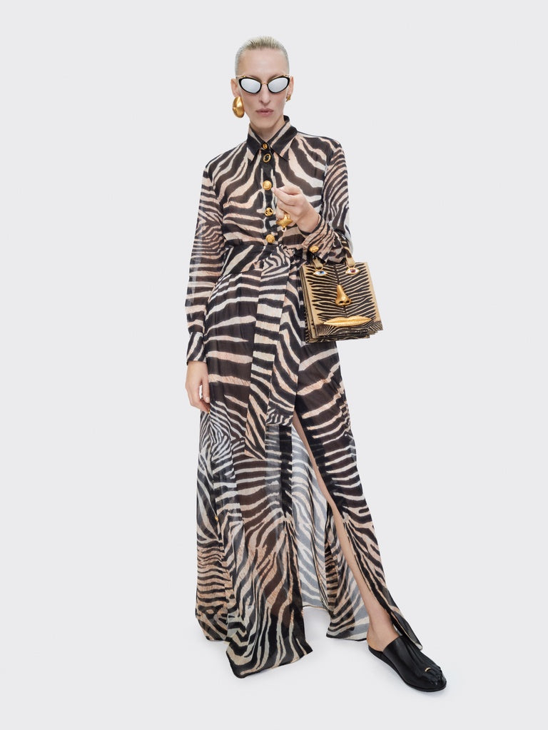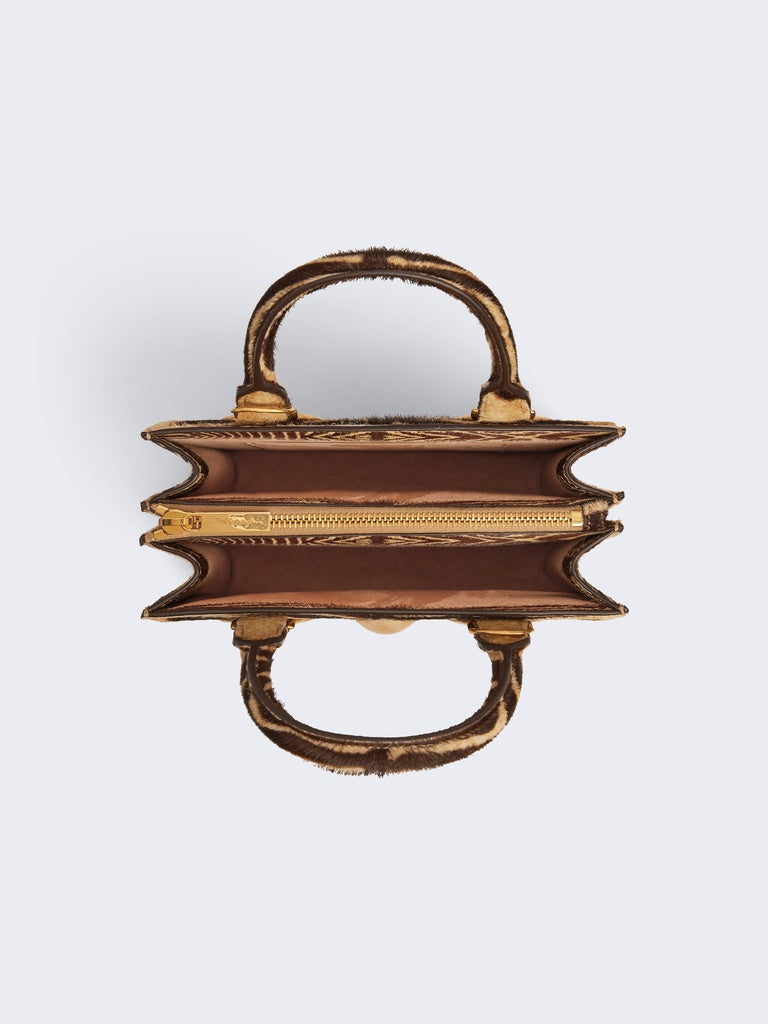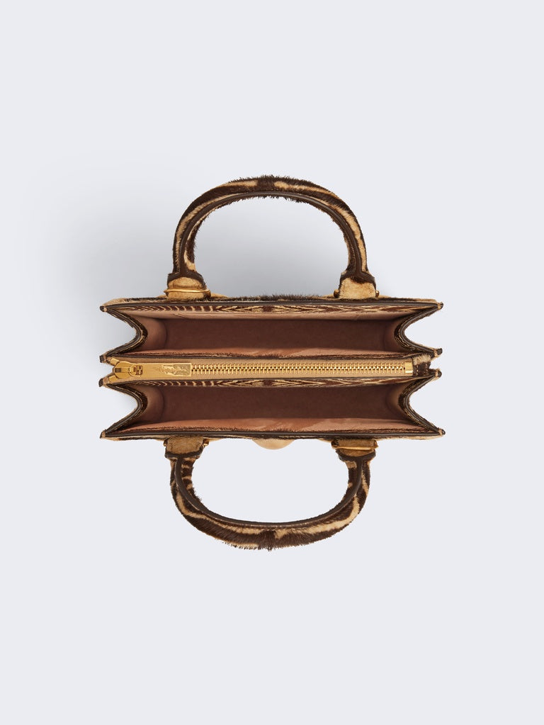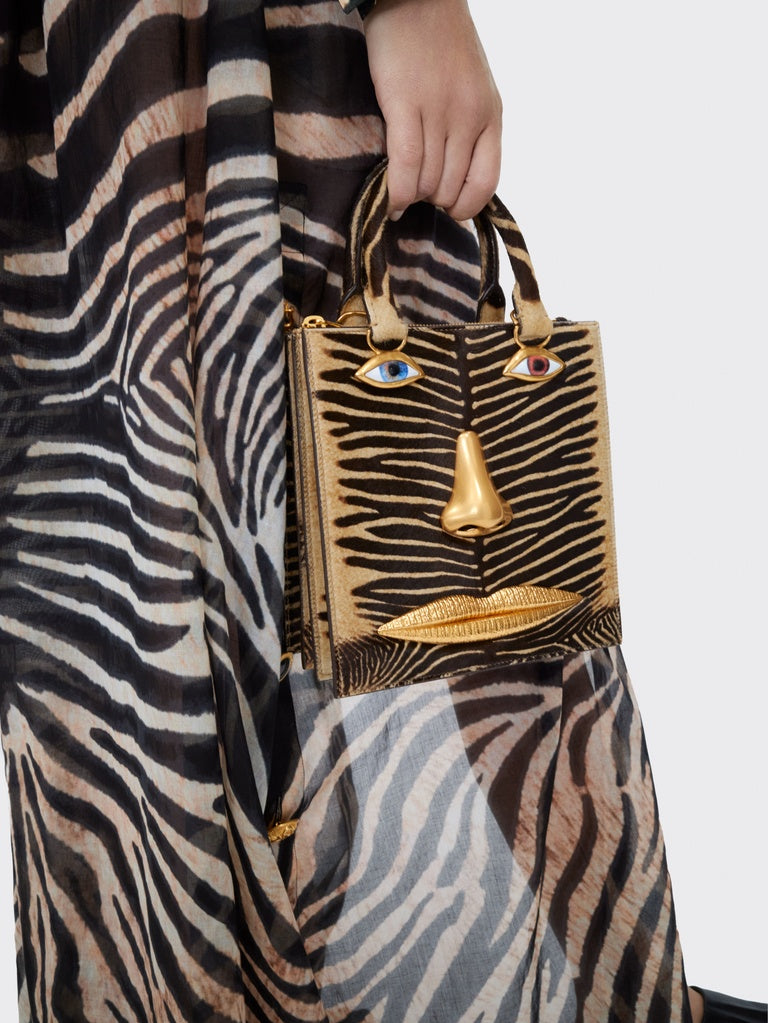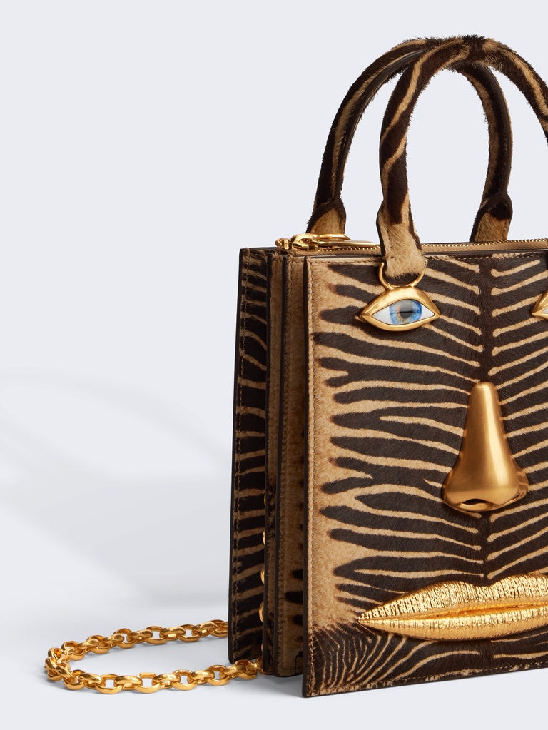 This Face handbag in zebra-patterned pony calfskin and lambskin interior is decorated with signature anatomical jewelry in enamel and hammered gilt brass forming a trompe-l'œil face.
