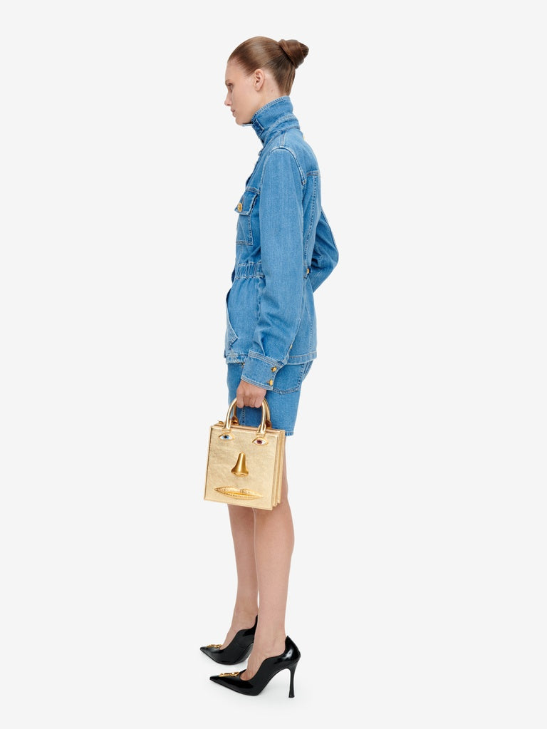 This Face handbag in gold laminated calfskin and lambskin interior is decorated with signature anatomical jewelry in enamel and hammered gilt brass forming a trompe-l'oeil face.