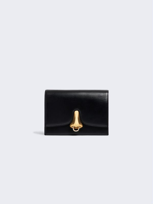 Its double-gusset construction folds back at the front using a magnetic flap with a gold-tone nose jewel set with a contrasting silver-tone metal piercing.