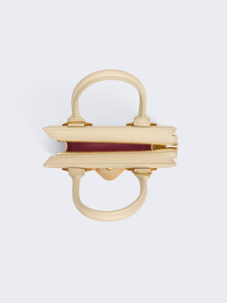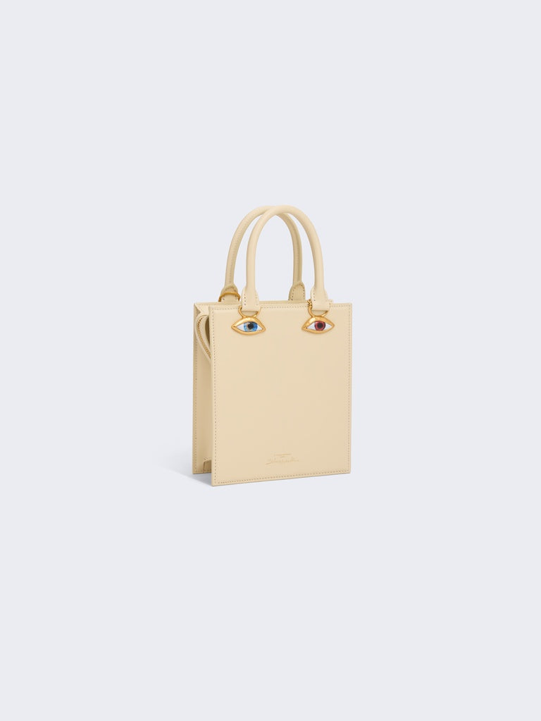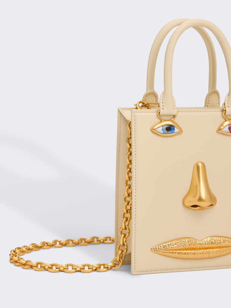 This Face handbag in mini format in ecru calfskin and pink lambskin interior is decorated with signature anatomical jewelry in enamel and hammered gold brass forming a trompe-l'œil face.