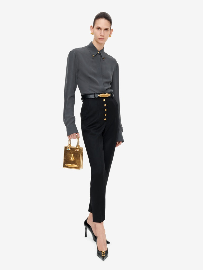 This Face handbag in a mini size, crafted from gold-laminated calfskin with a pink lambskin lining, is adorned with signature anatomical jewels in enamel and hammered gold-plated brass, forming a trompe-l'oeil face.