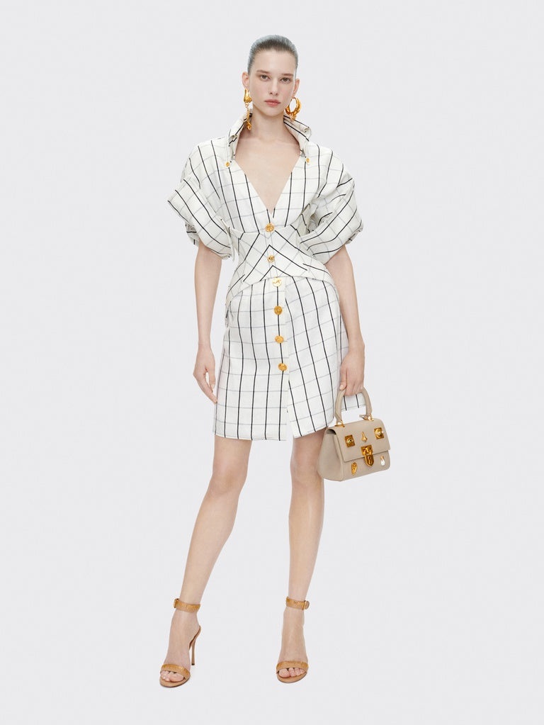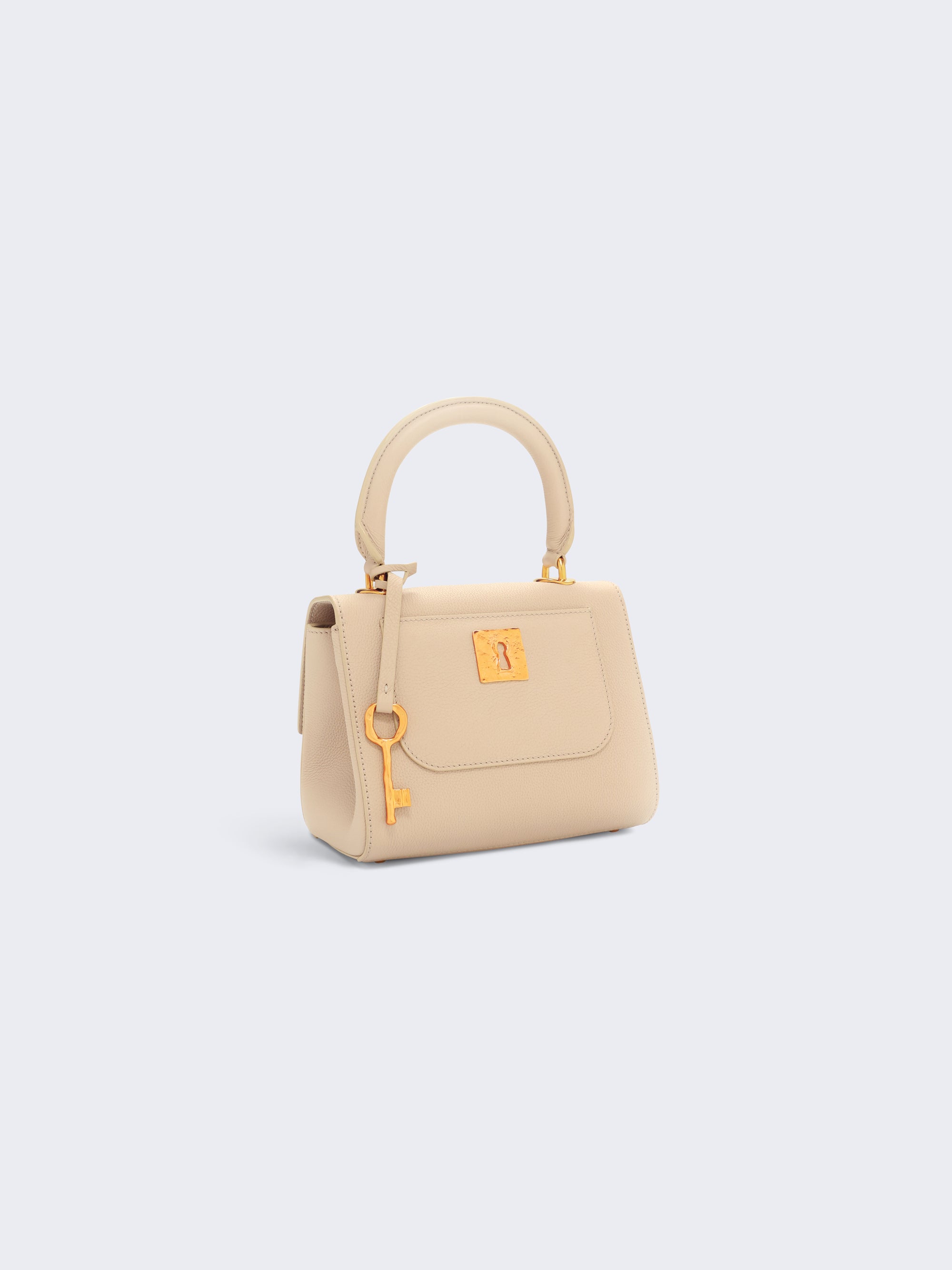 This mini Secret bag in grey calfskin is decorated with jewel buttons in hammered gold brass and enamel paying homage to the House's iconic codes, notably the Padlock.