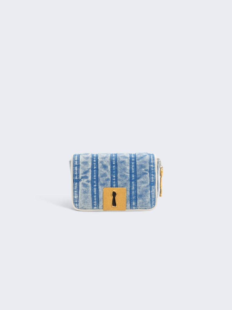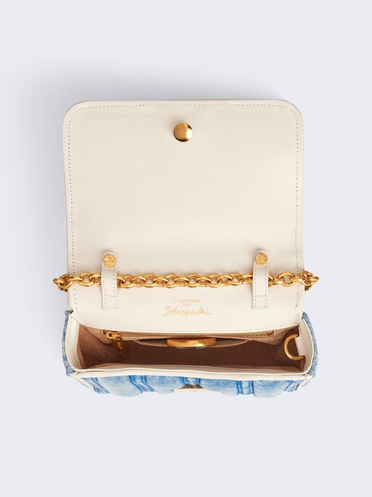 This Schiap pouch is crafted from overdyed and washed blue cotton, dubbed "perfect cotton" by our Creative Director Daniel Roseberry, embossed with the signature Tape Measure motif. It is adorned with a signature Keyhole plaque, a link chain, and a gold-tone brass Key charm on the side.