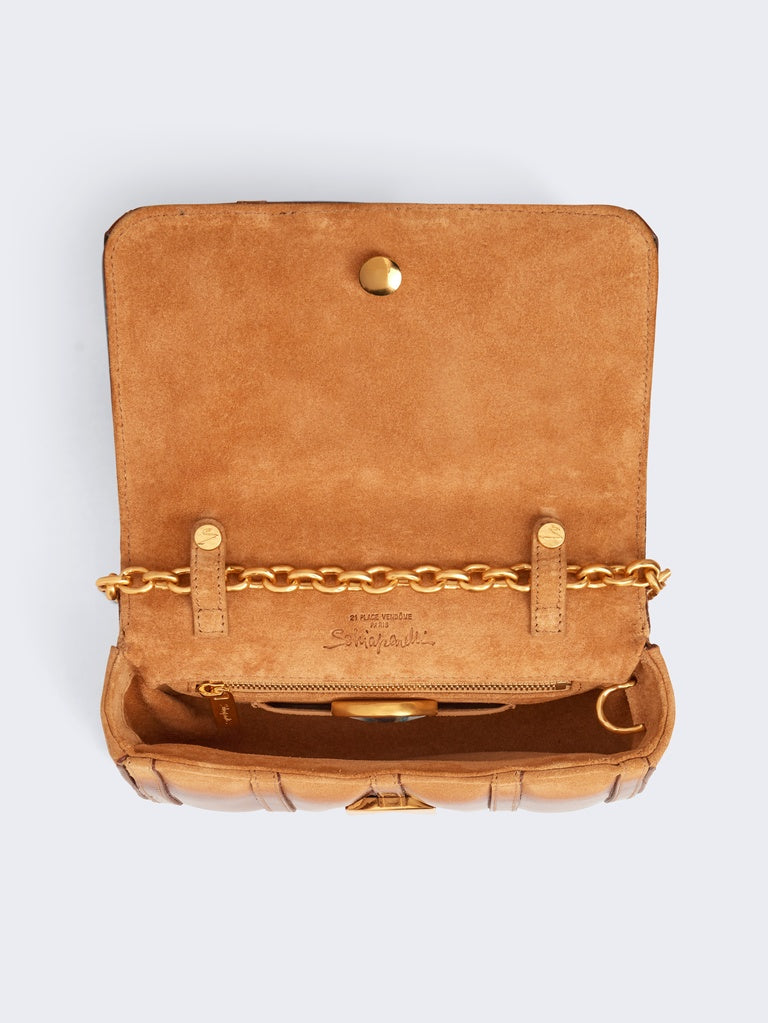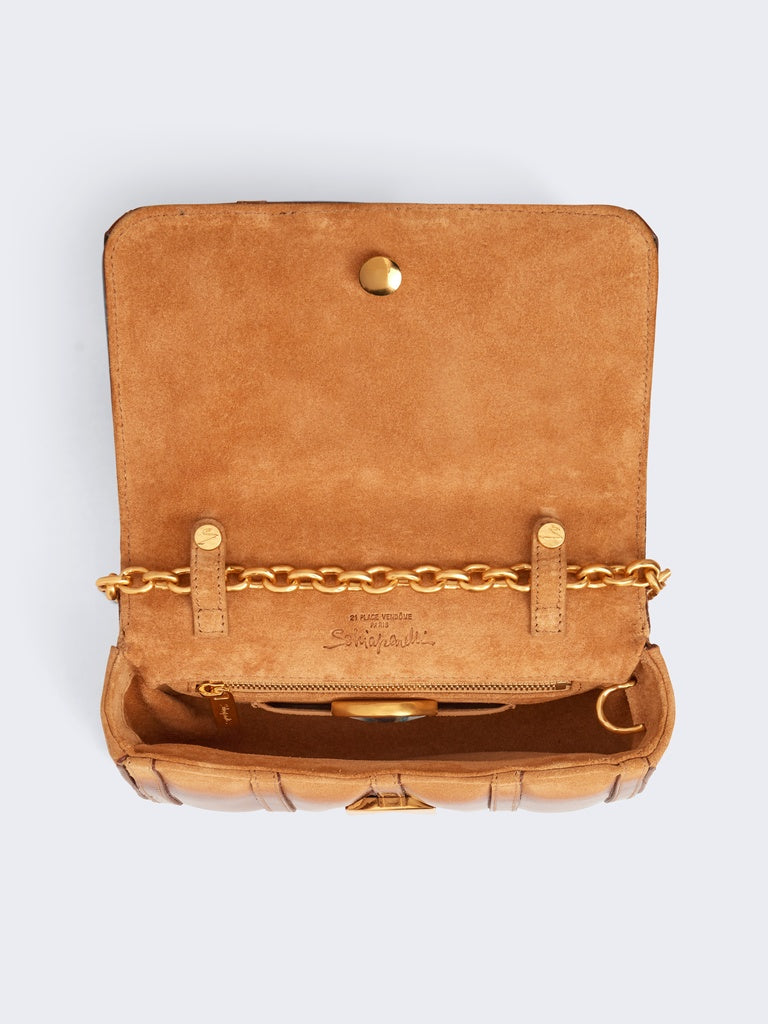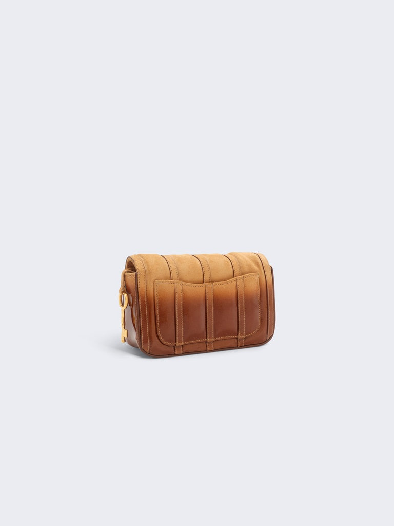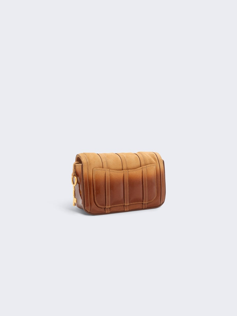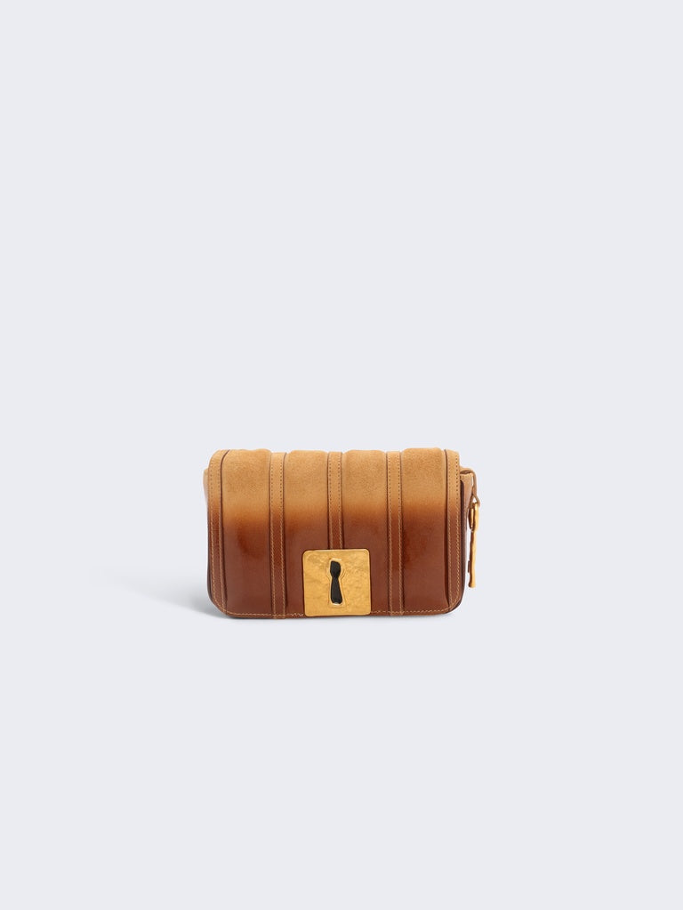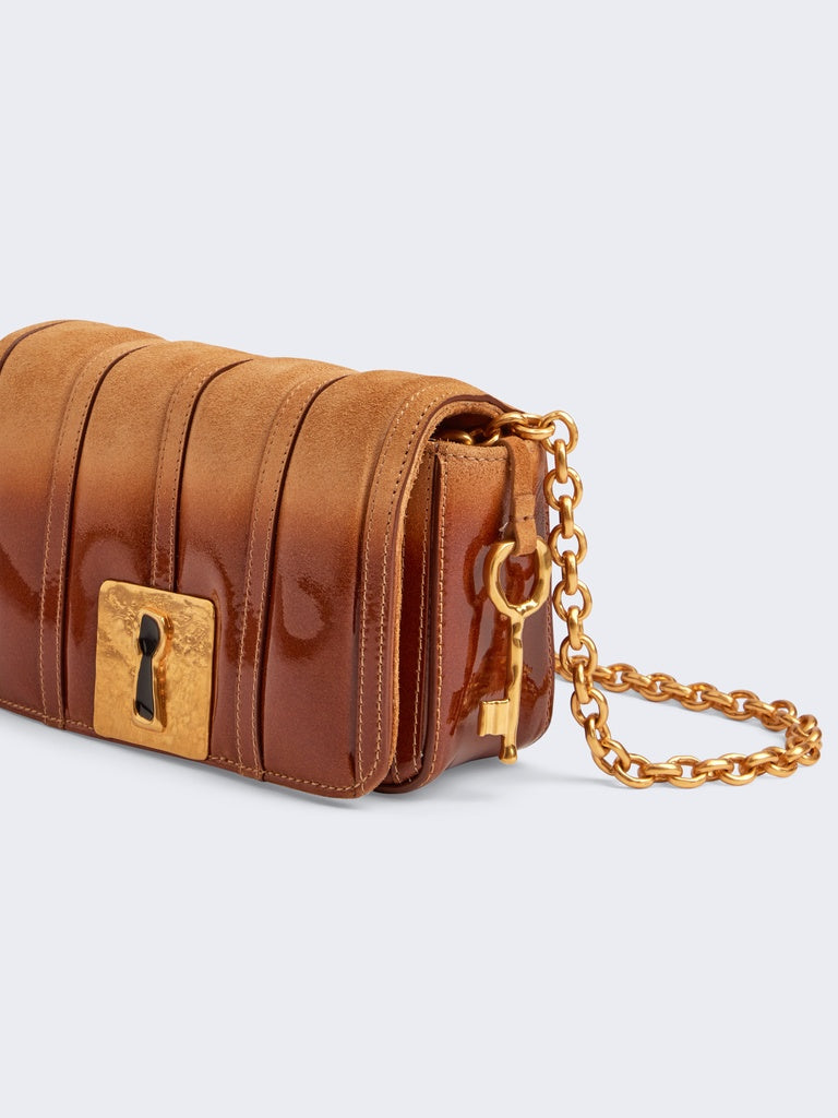The Schiap pouch is crafted from brown suede, hand-spray painted to create this glossy gradient effect, embossed with the signature Tape Measure motif, and adorned with a signature Keyhole plaque, a link chain, and a gold-plated brass Key charm on the side.