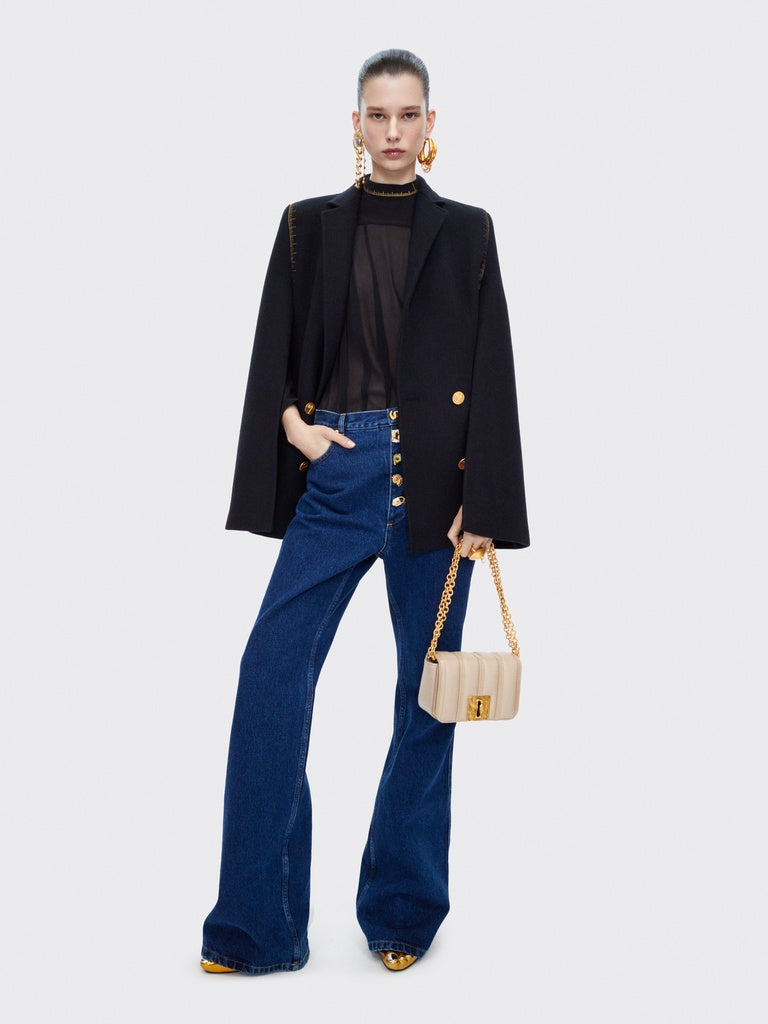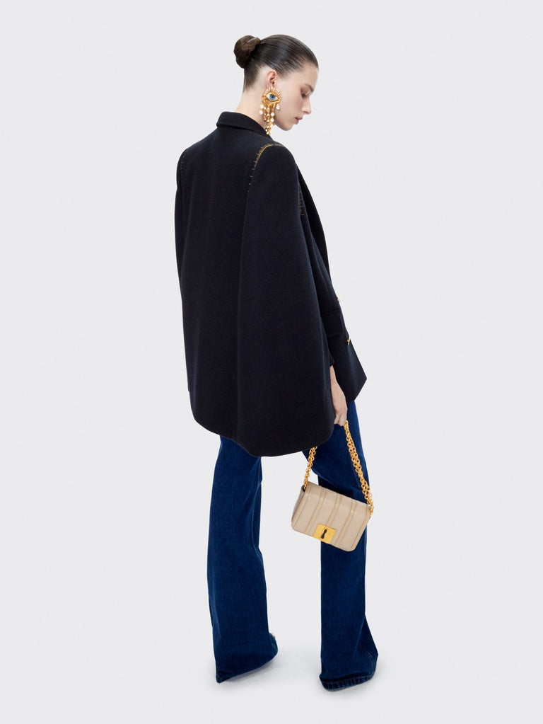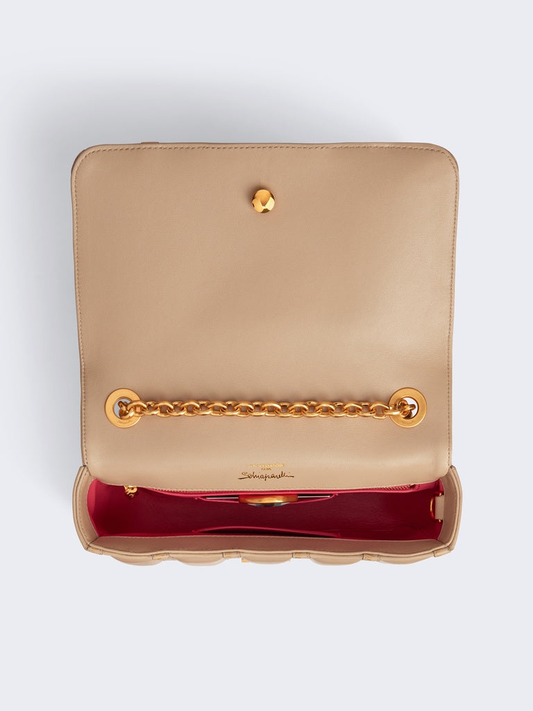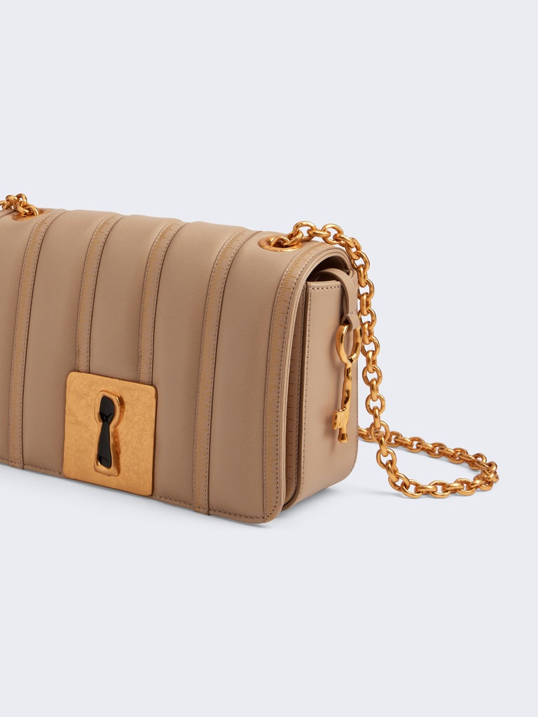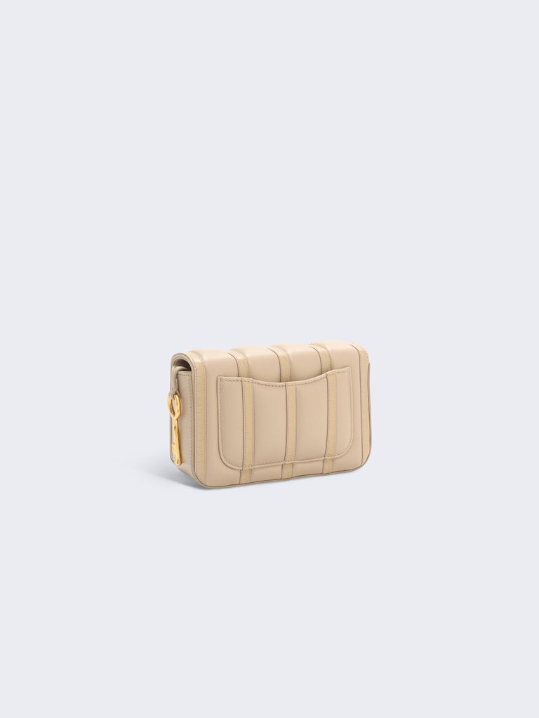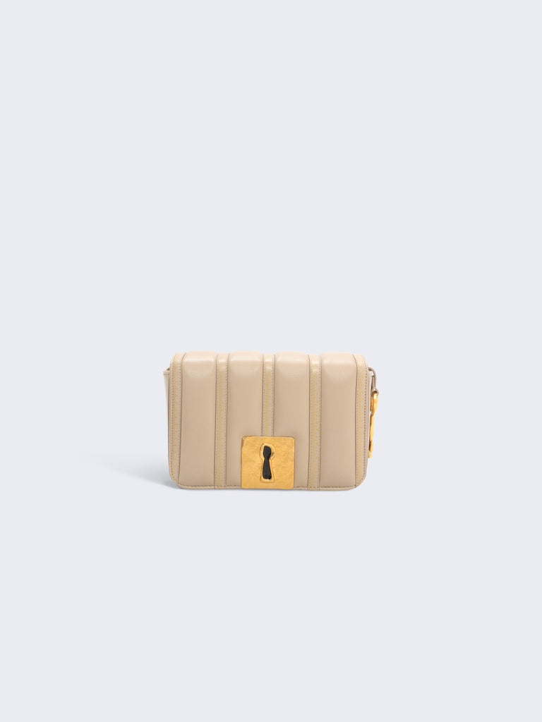 This small Schiap bag is crafted from tone-on-tone ecru trapunto leather embossed with the signature Tape Measure motif and adorned with a signature Keyhole plaque, a link chain and a gold brass Key charm on the side.