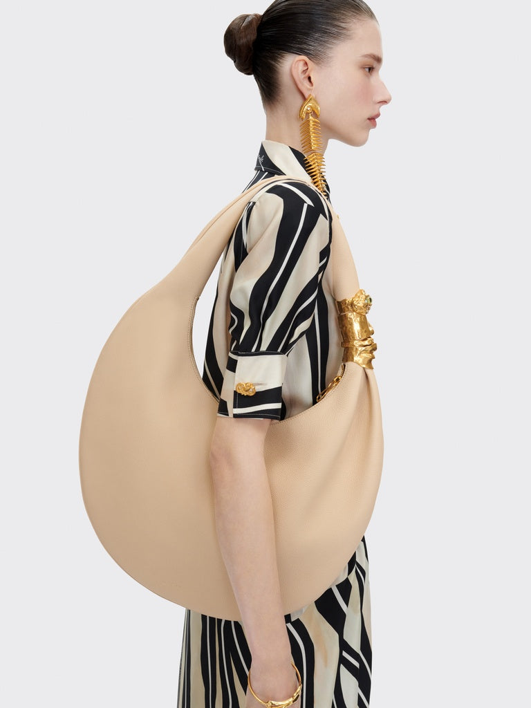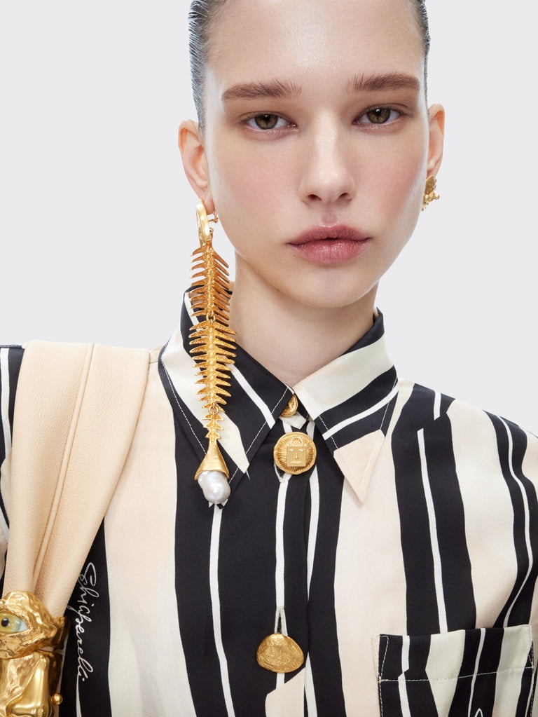 These hammered gold brass and rhinestone earrings depicting a fish skeleton topped with a baroque pearl are inspired by the House's surrealist aesthetic.