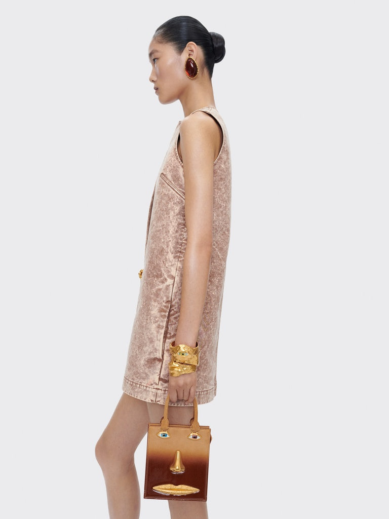 These abstract earrings in gold-plated brass are topped with an amber-colored resin cabochon.