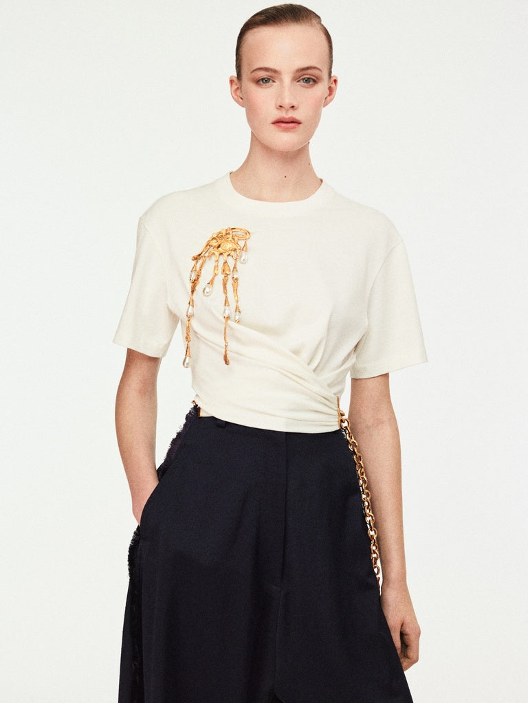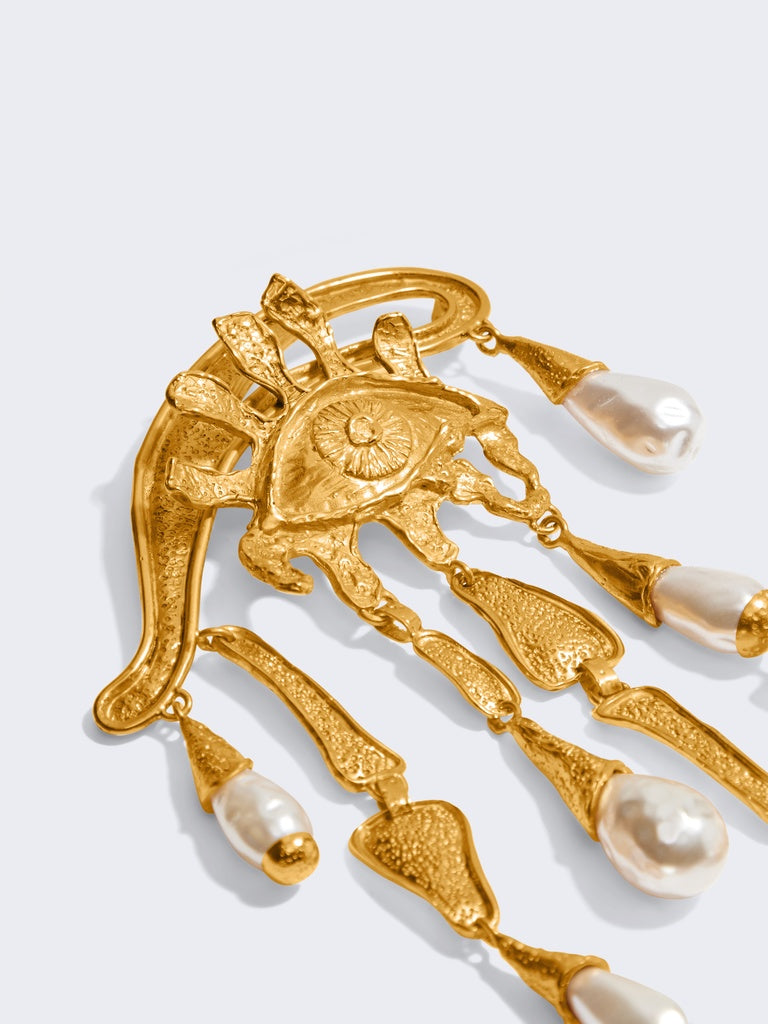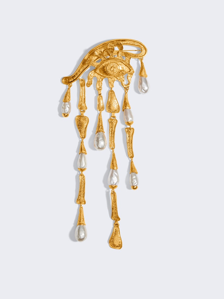 This sculptural brooch in textured gold brass and pearls, representing an eye enhanced with tears, is inspired by the surrealist aesthetic of the House.
