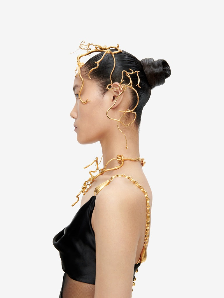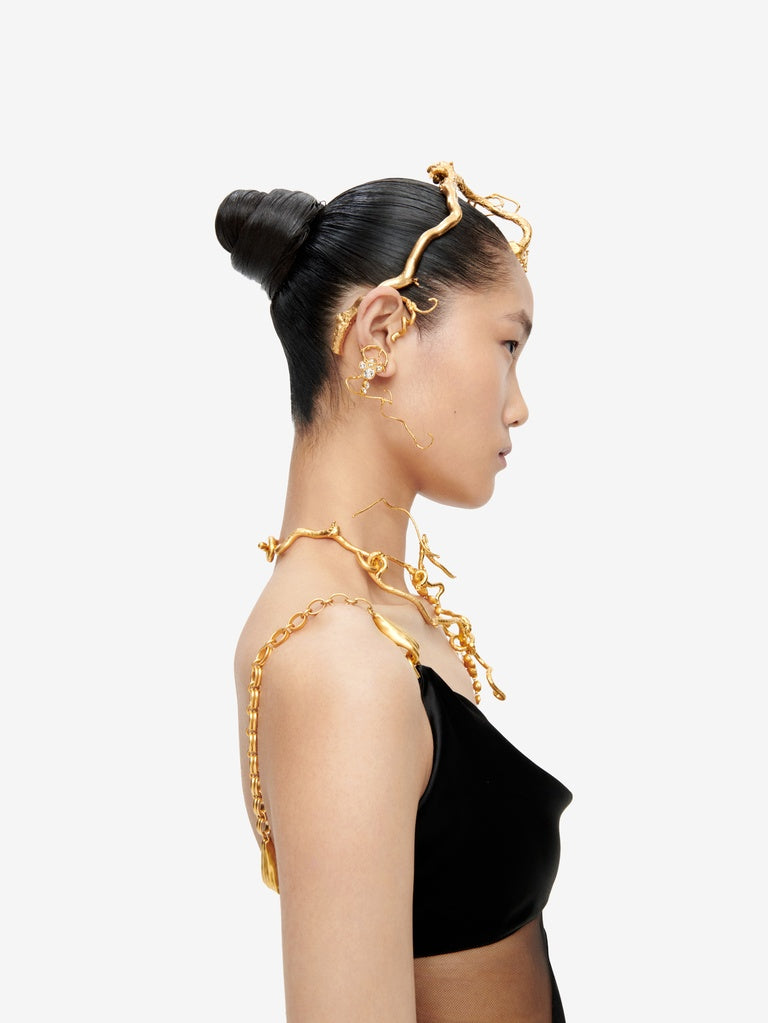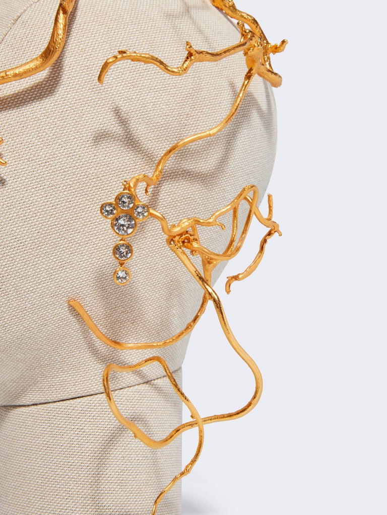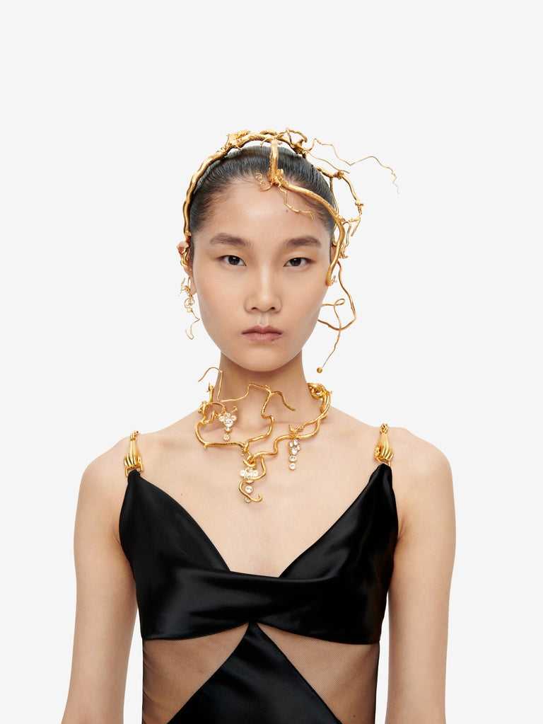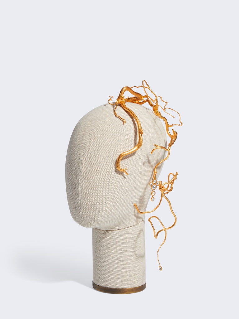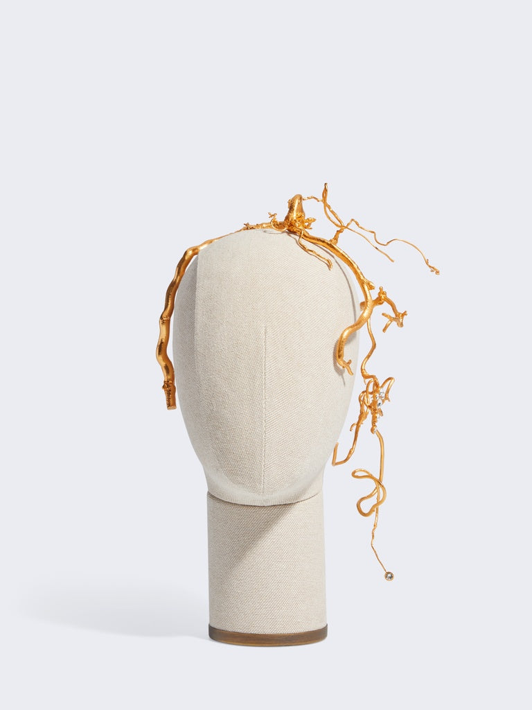 This gold-plated brass headband featuring a slender, twisted hazelnut branch with grapes of rhinestones hanging from it is inspired by the organic shapes of the collection.
