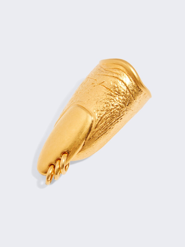 This trompe l'oeil brass ring depicting a finger adorned with a piercing on the nail is inspired by the surrealist aesthetic of the Maison. It is available in 41.