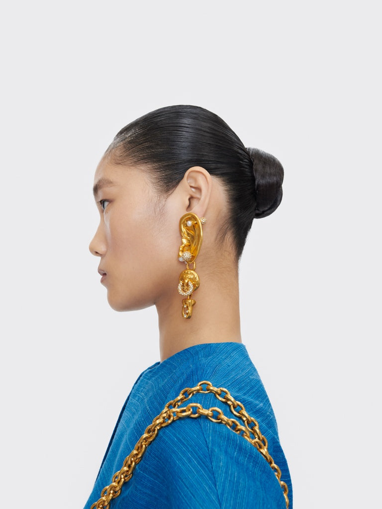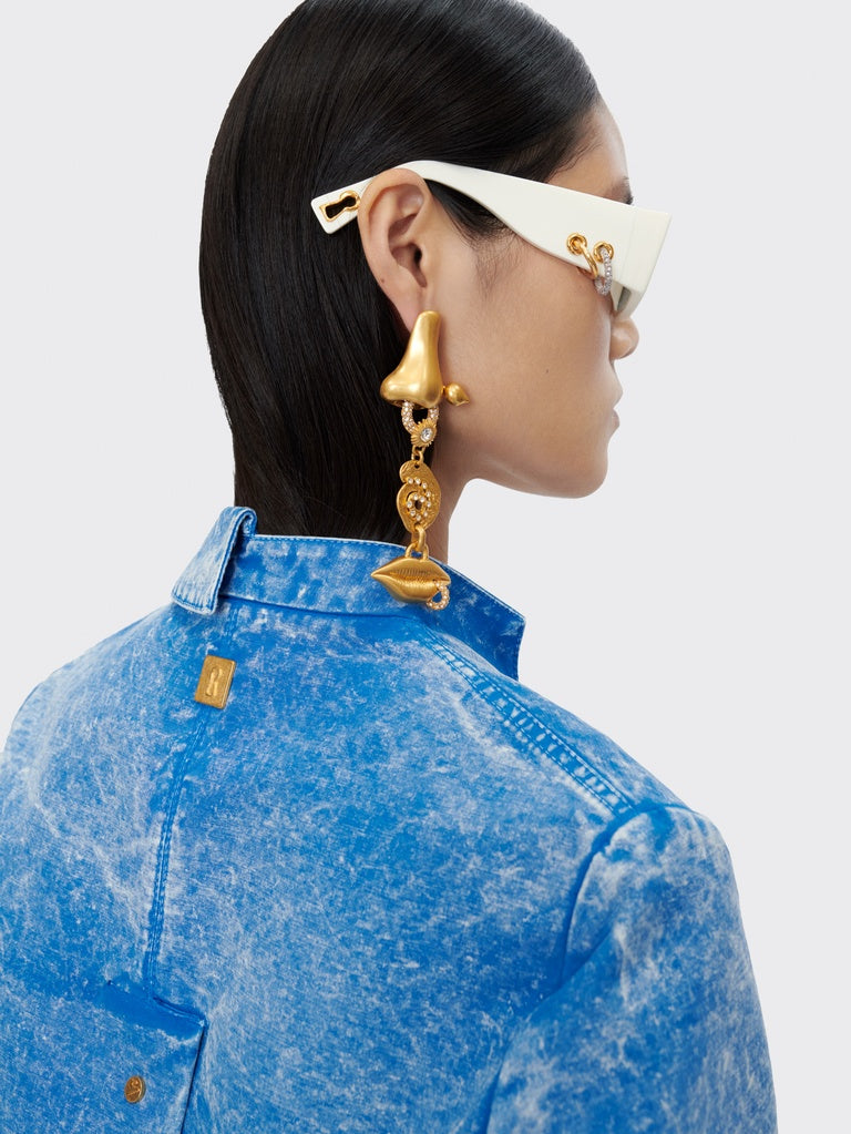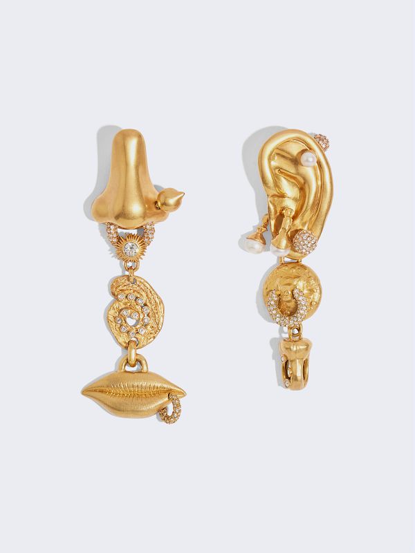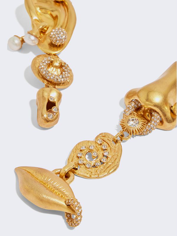 These earrings are made of brass, embellished with rhinestones and pearls. They are composed of a pierced nose, a snail and a surreal mouth on one side; and a surreal ear, a pierced nipple and a tooth jewel on the other.