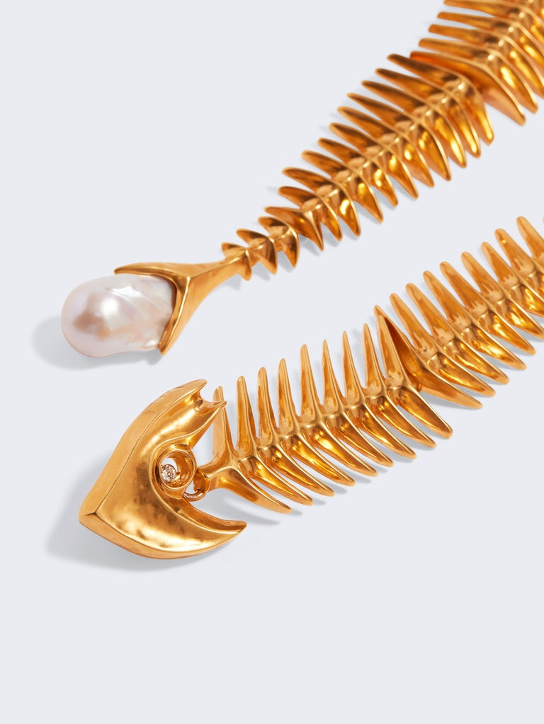 These hammered gold brass and rhinestone earrings depicting a fish skeleton topped with a baroque pearl are inspired by the House's surrealist aesthetic.