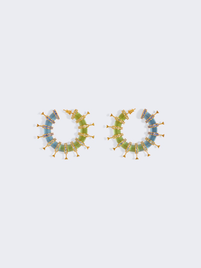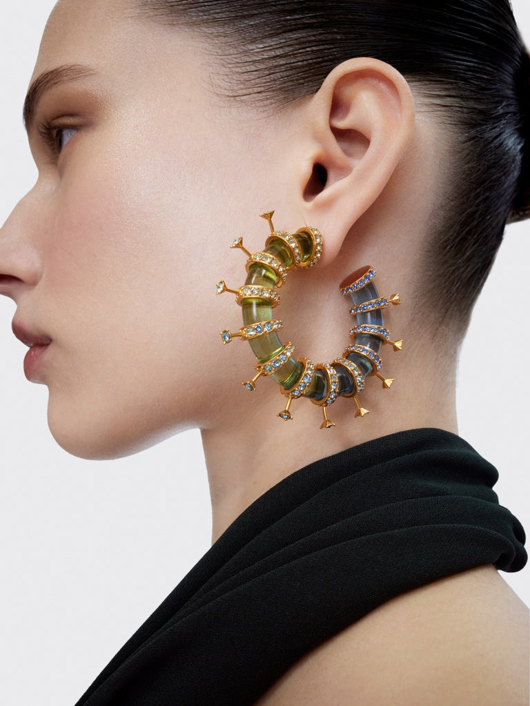 These abstract hoop earrings in gradient blue and green resin are topped with rhinestone spikes.