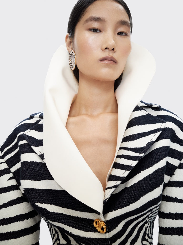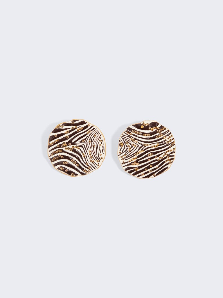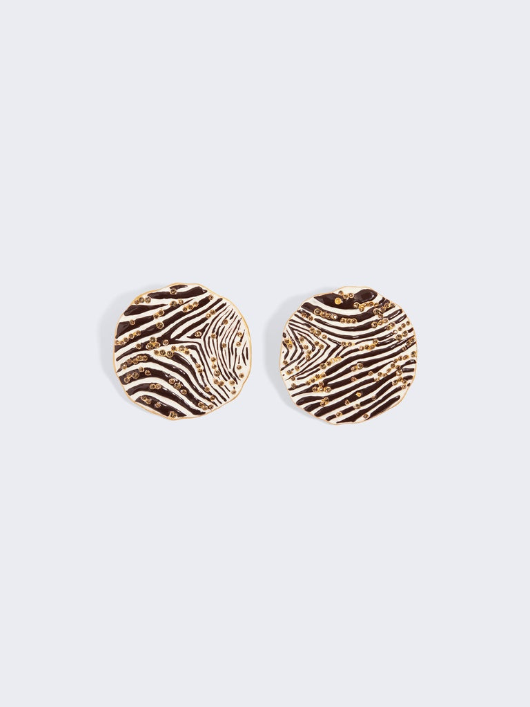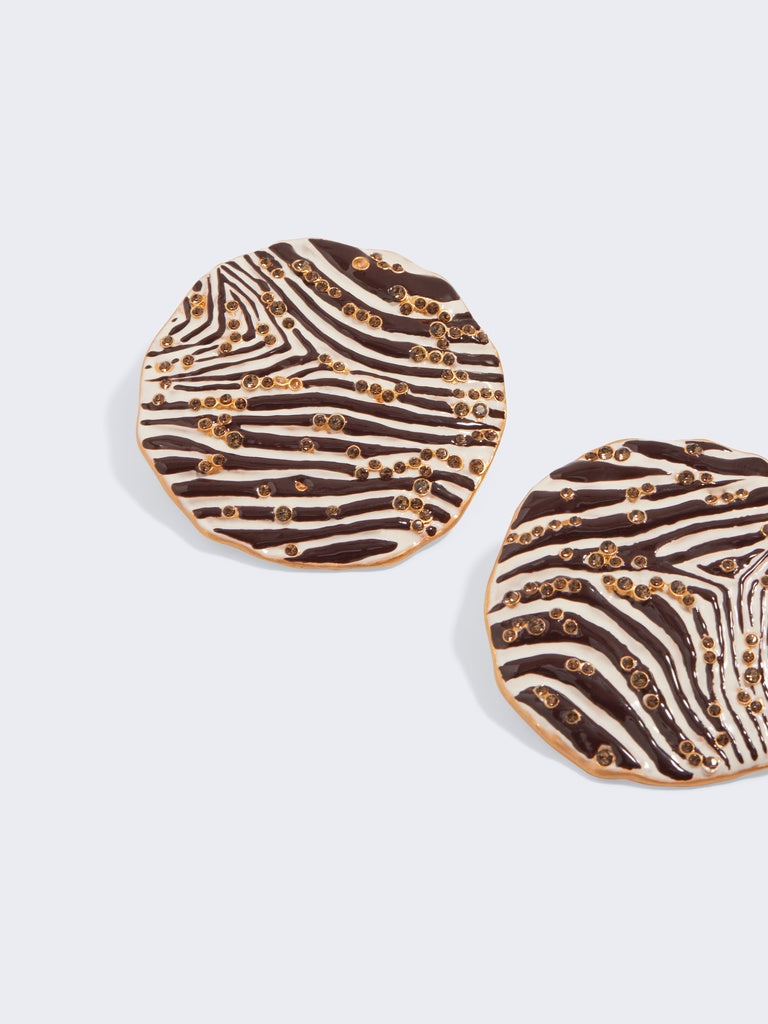 These zebra-striped brass, enamel and rhinestone earrings are inspired by one of the season's key prints.