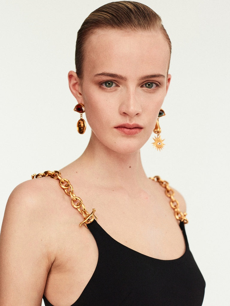 Beneath the brown eye, a medal of the Virgin Mary as a pendant.