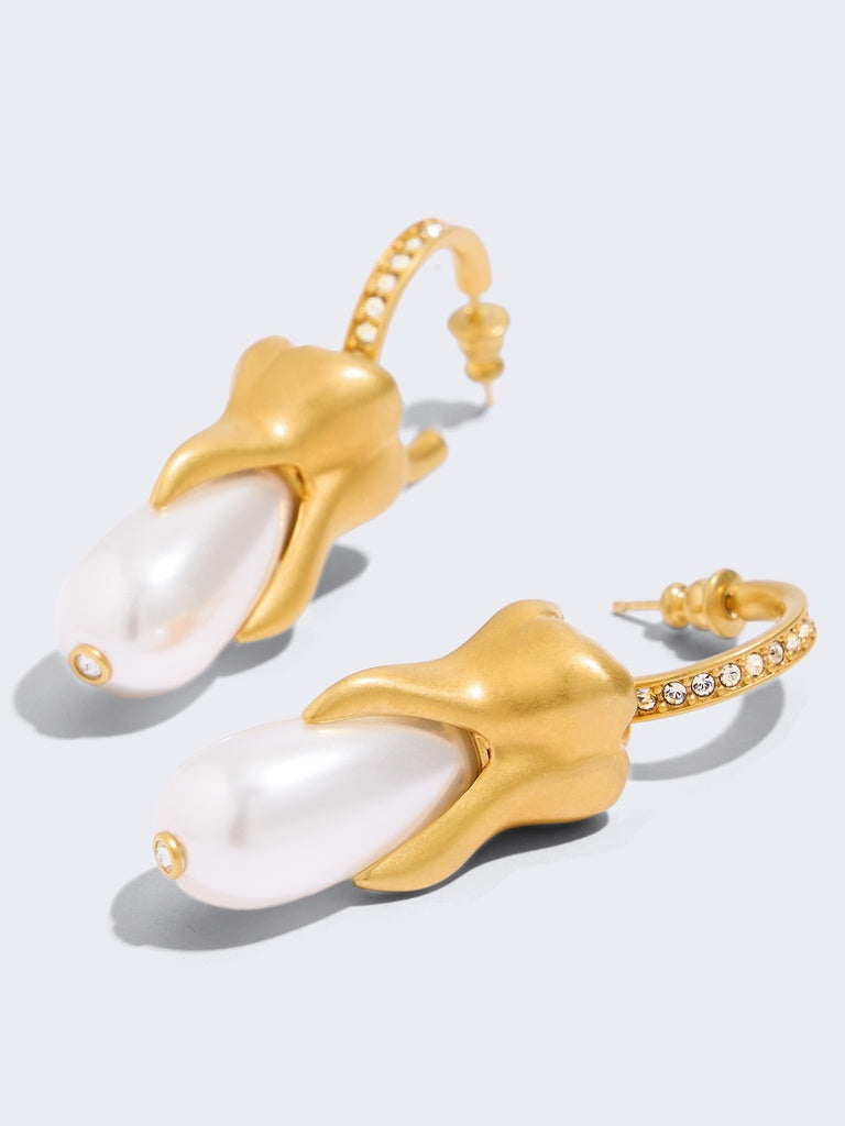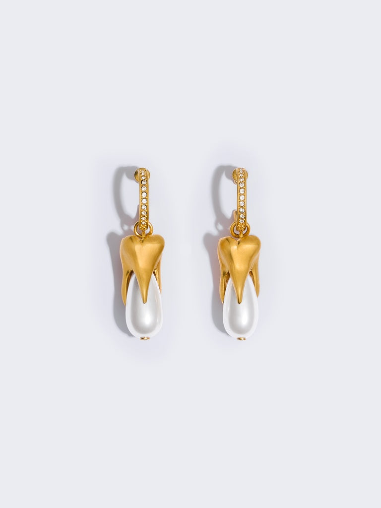 Small gold-plated brass earrings in the shape of teeth enclosing teardrop-shaped beads.