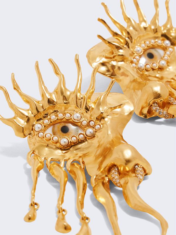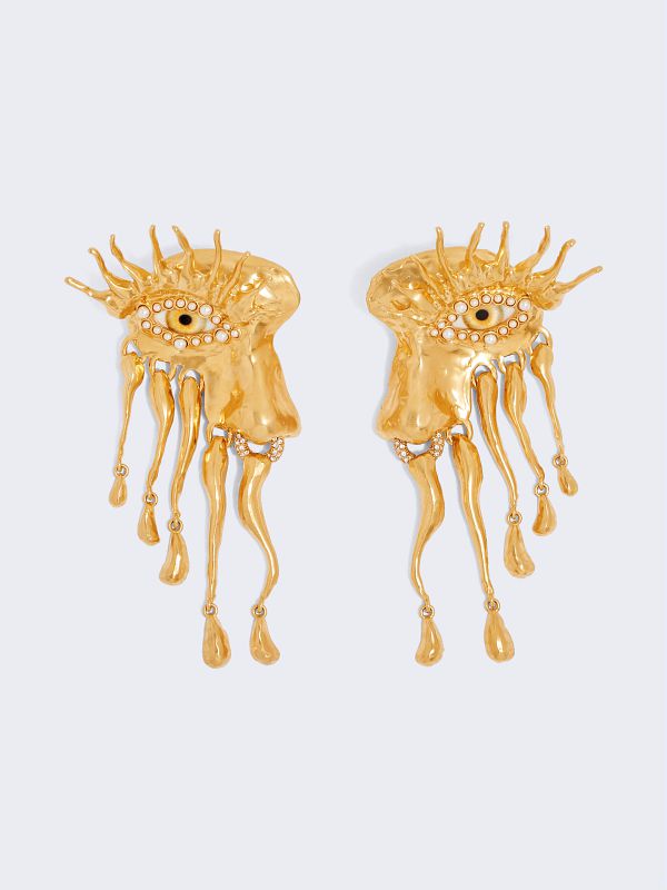 Gold-plated brass drop earrings depicting two green paved eyes with pearly eyelashes, with articulated gold-plated metal tears.