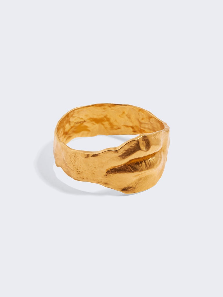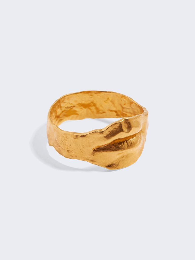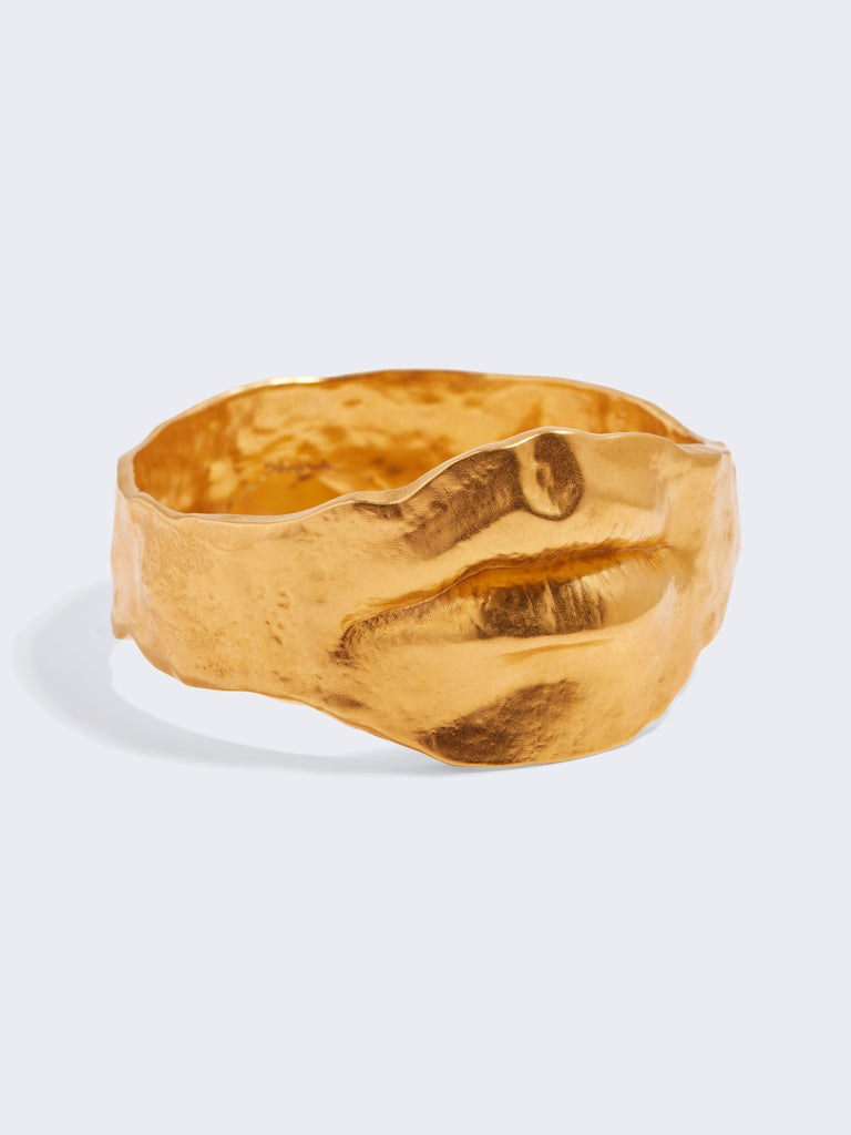 This cuff bracelet representing a signature Mouth in hammered gold brass and enamel pays homage to the iconic anatomical codes of the House.