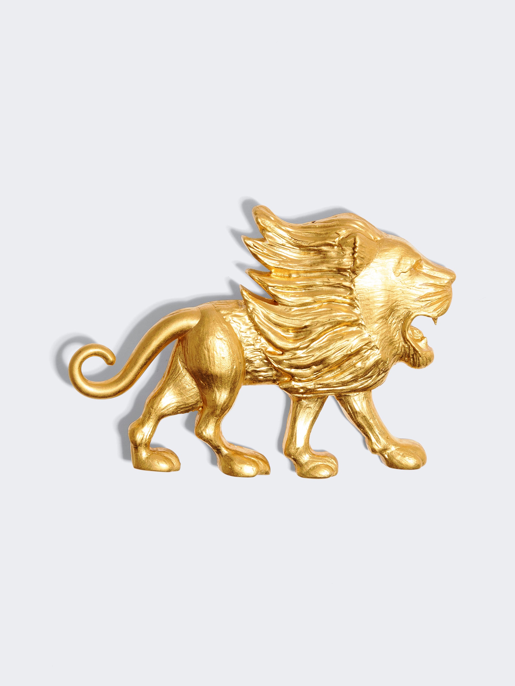 Leo astrological sign brooch in hammered gilt brass, with Schiaparelli logo on the back.