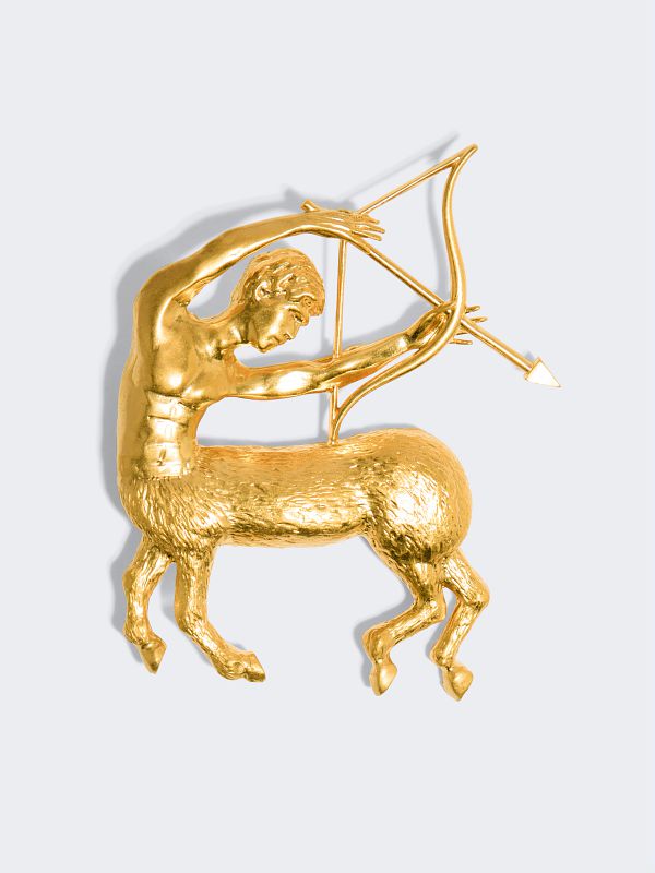 Sagittarius astrological sign brooch in hammered gilt brass, with Schiaparelli logo on the back.
