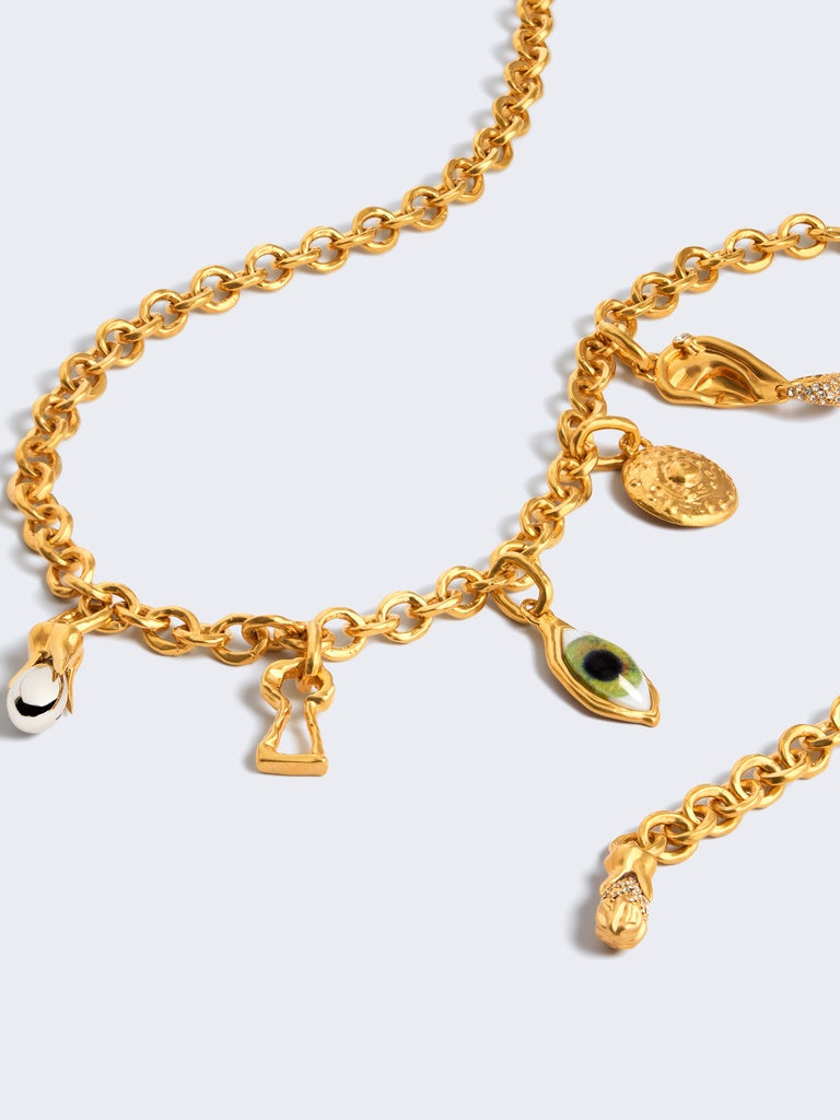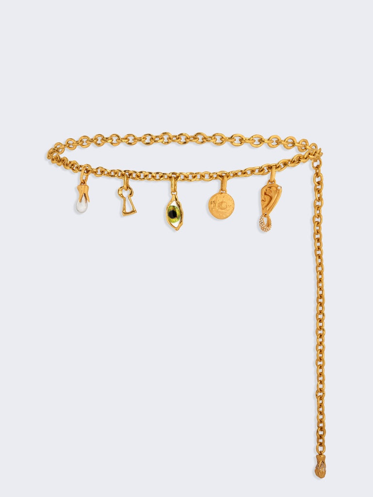 This brass chain jewelry belt is enhanced with anatomical lucky charms bearing the House's codes.