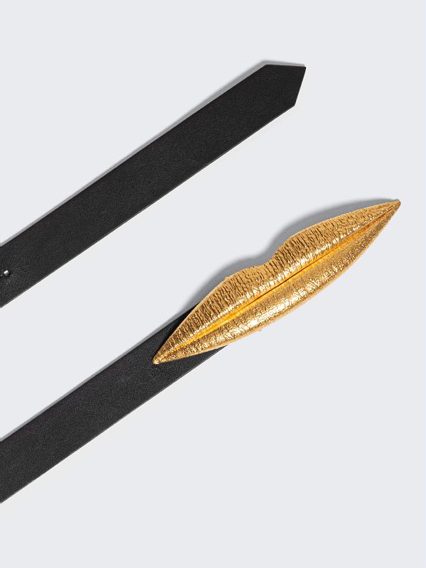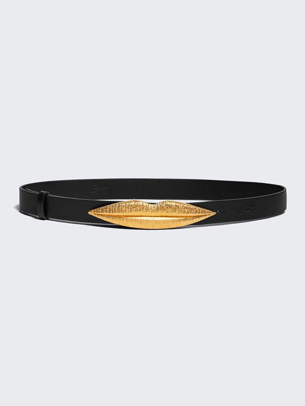 A fine calfskin leather belt adorned with a trompe-l'œil clasp in hammered gilt brass in the shape of a mouth. It is characterized by clean edges and a tone-on-tone edge dyeing, meticulously applied by hand.