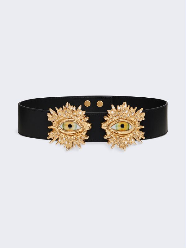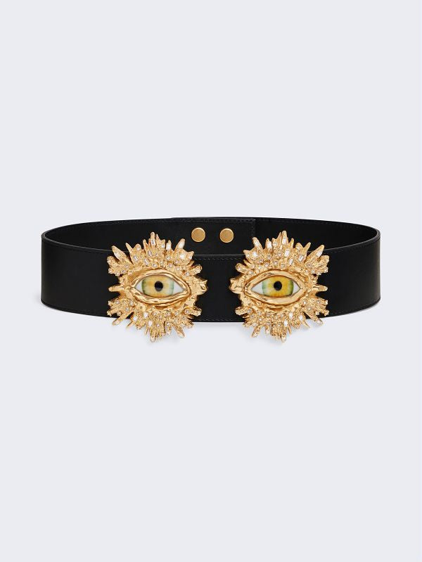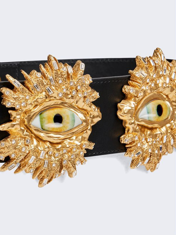 This wide belt is crafted from smooth black calfskin leather. Its design is intended to be worn at the waist. Surrealist eyes framed in hammered gold brass and adorned with crystal fragments embellish the front. It fastens at the back with four snap buttons.