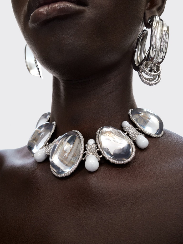 This abstract choker necklace features a series of crystal-colored resin cabochons adorned with rhinestones.