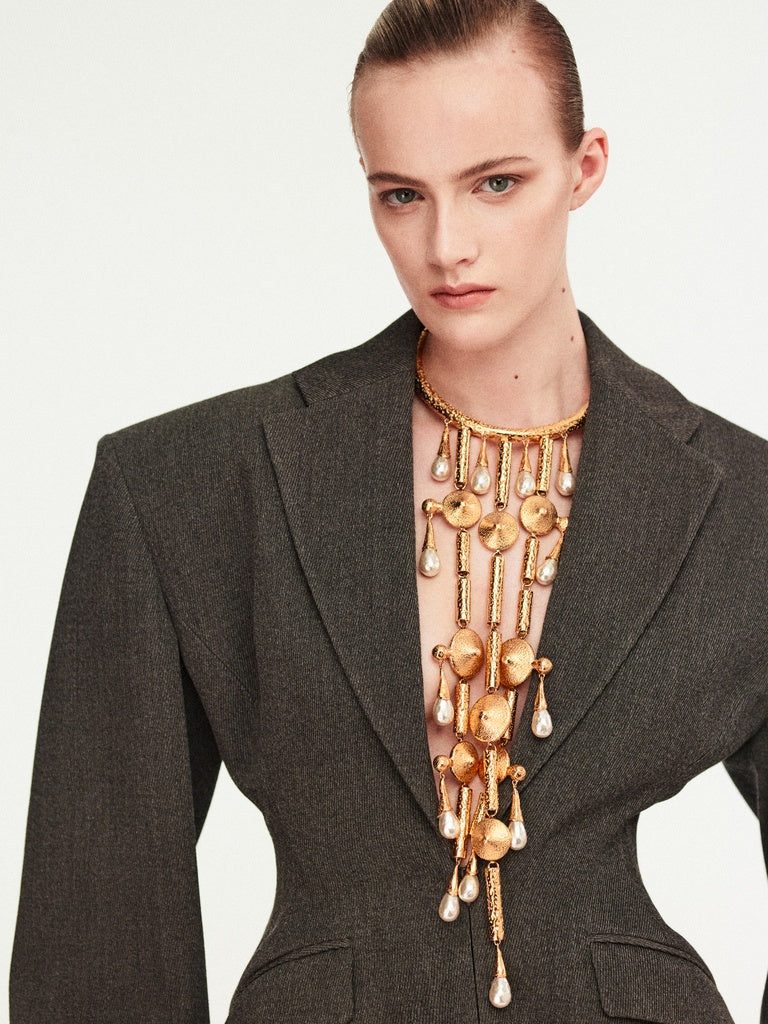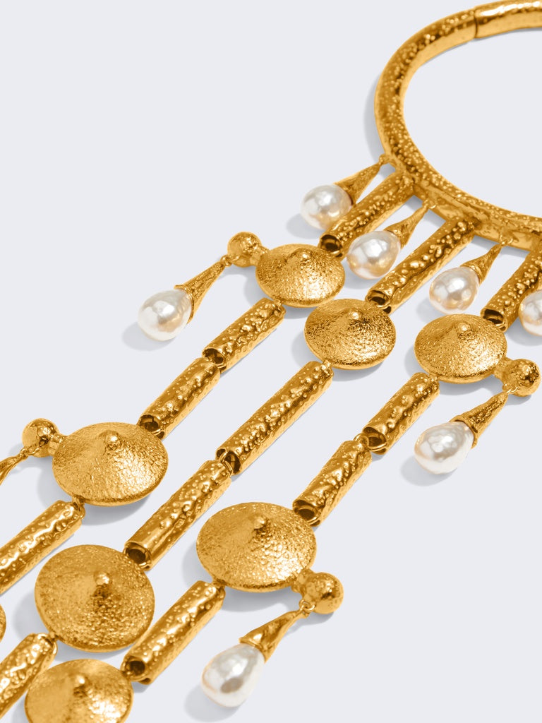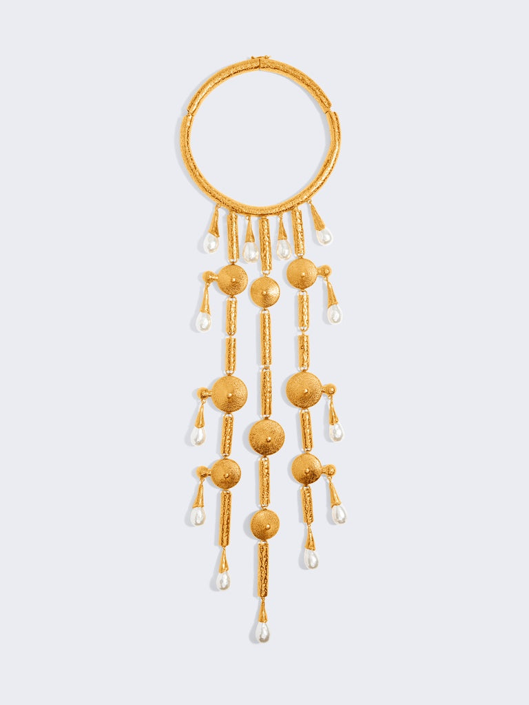 This long bib necklace with a chandelier-like feel, made of hammered gilt brass with stacked jewels bearing iconic Schiaparelli codes such as the Nipple, is inspired by the surrealist aesthetic of the House.