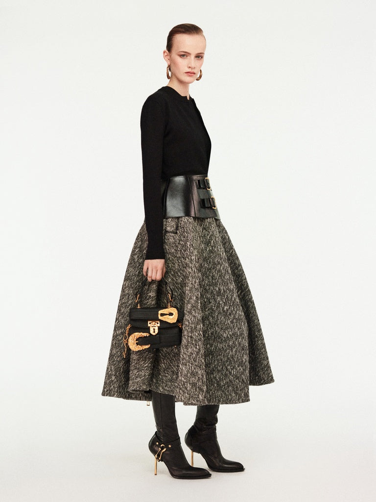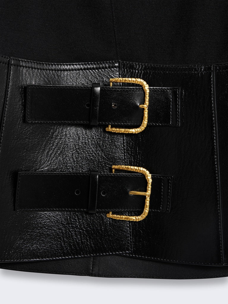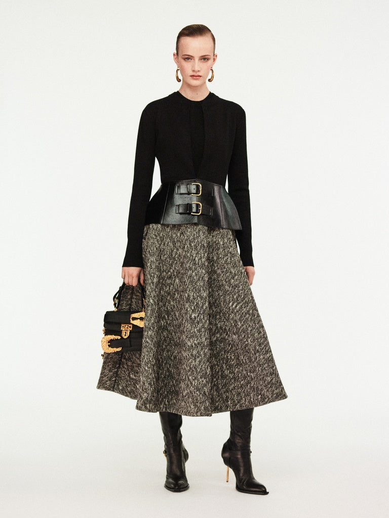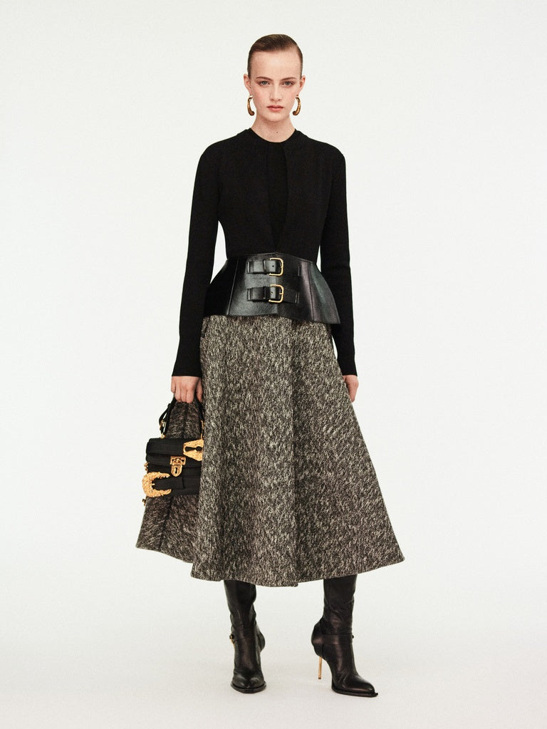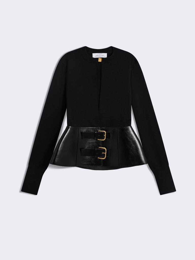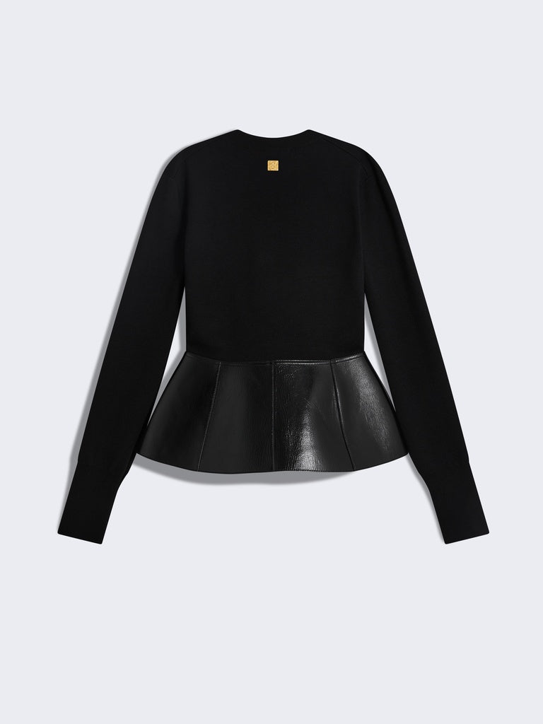 This two-tone cardigan with a close fit is knitted in black merino wool. It is enhanced with a tone-on-tone leather peplum adorned with leather fastening tabs featuring a gold-tone metal eyelet and a gold-tone metal keyhole rivet at the back.