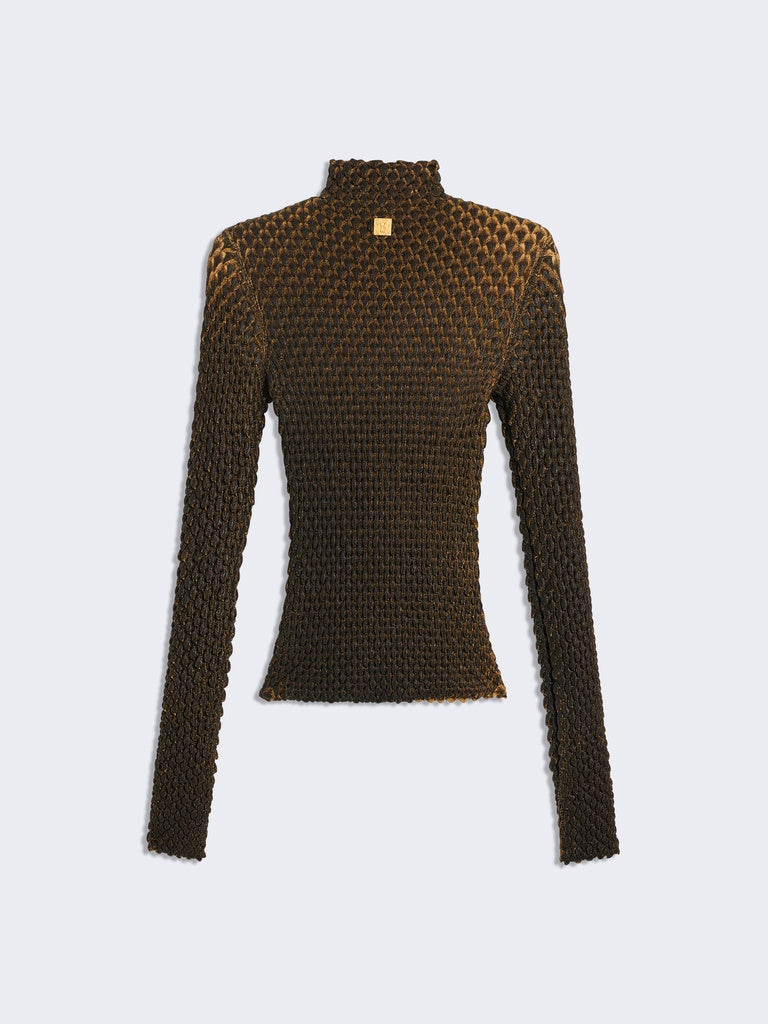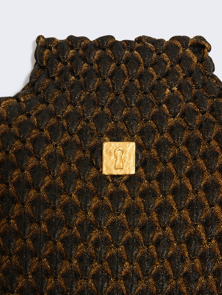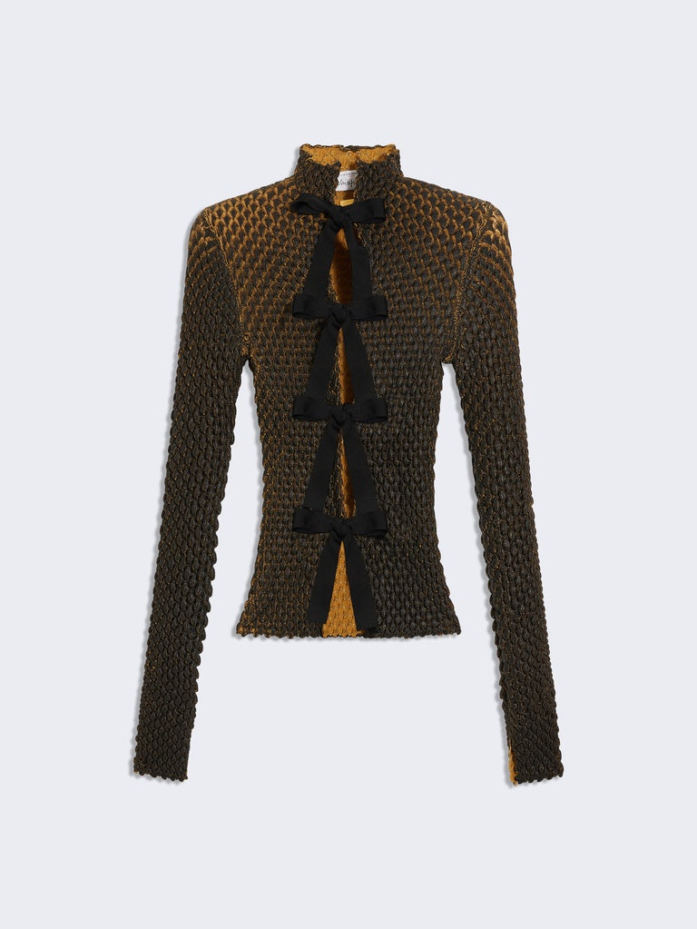 This fitted cardigan with long sleeves and a high neck is knitted in a yellow knit with a black laminated "snake scale" effect. It is embellished with tone-on-tone black grosgrain bows and a signature gold-tone metal keyhole rivet on the back.