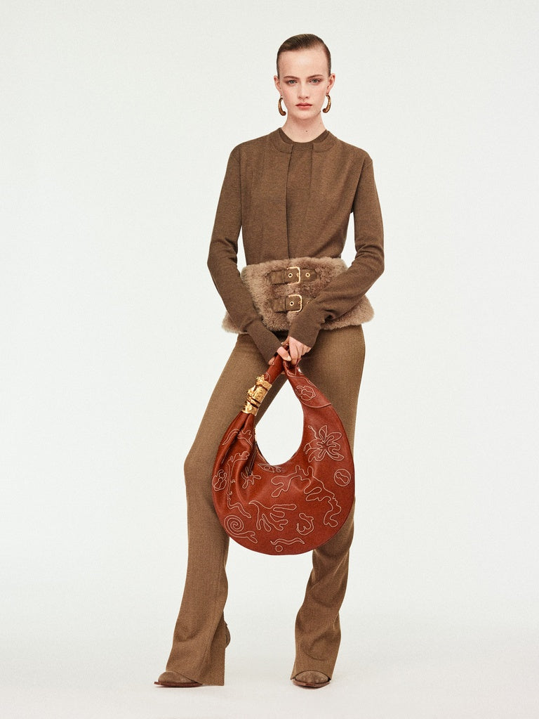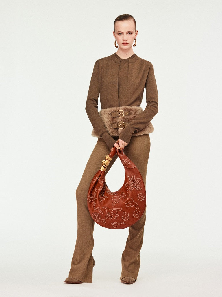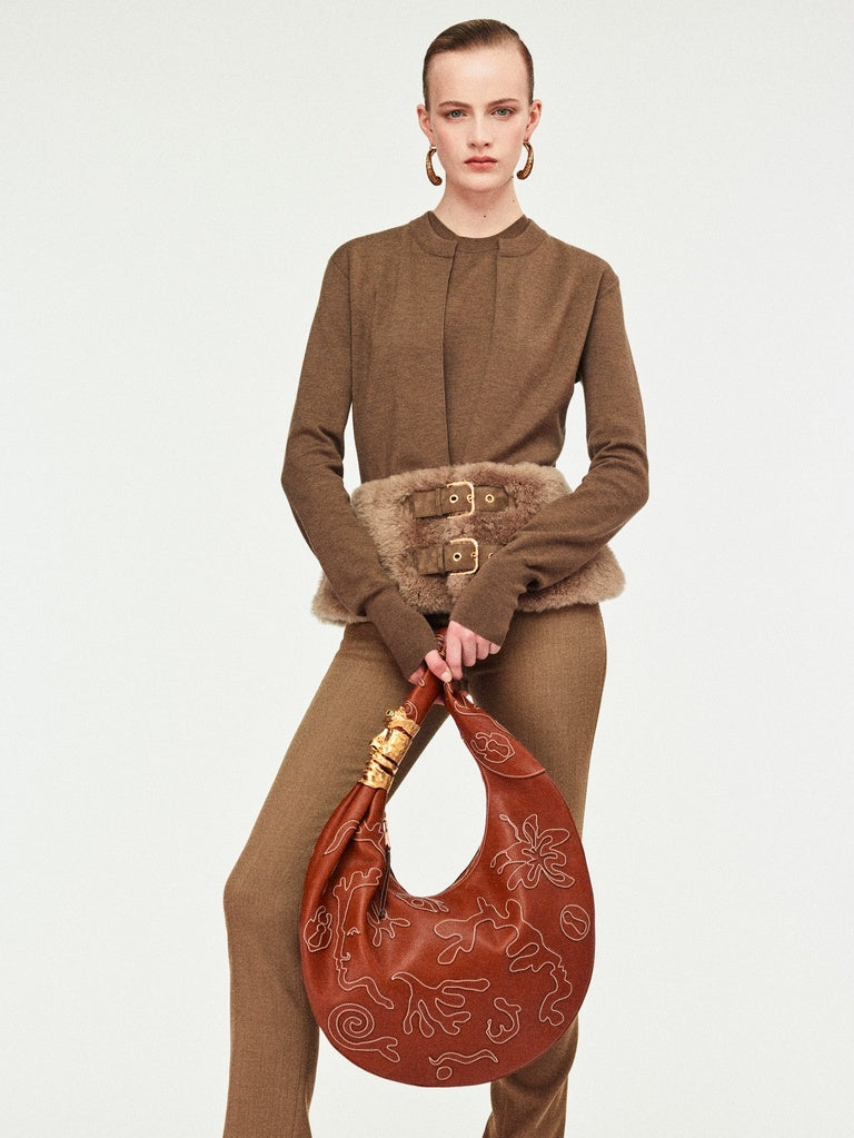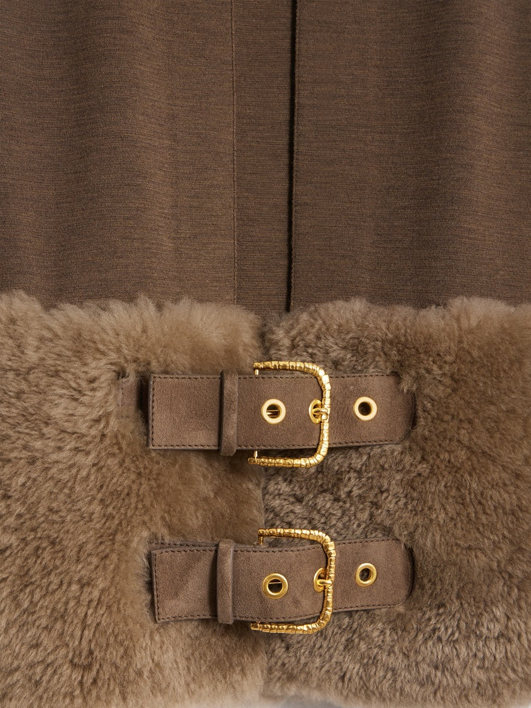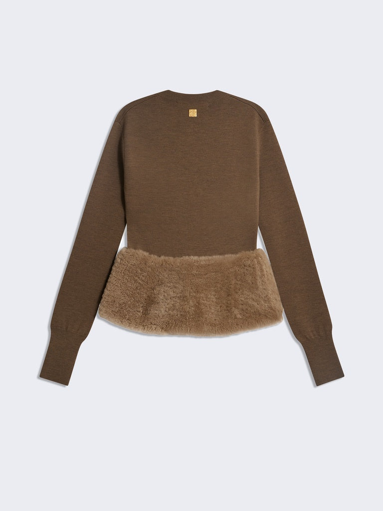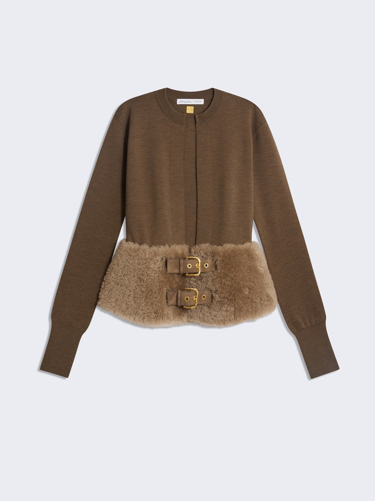 This two-tone cardigan with a close fit is knitted in brown merino wool. It is enhanced with a tone-on-tone shearling peplum adorned with leather fastening tabs featuring a gold-tone metal eyelet and a gold-tone metal keyhole rivet at the back.