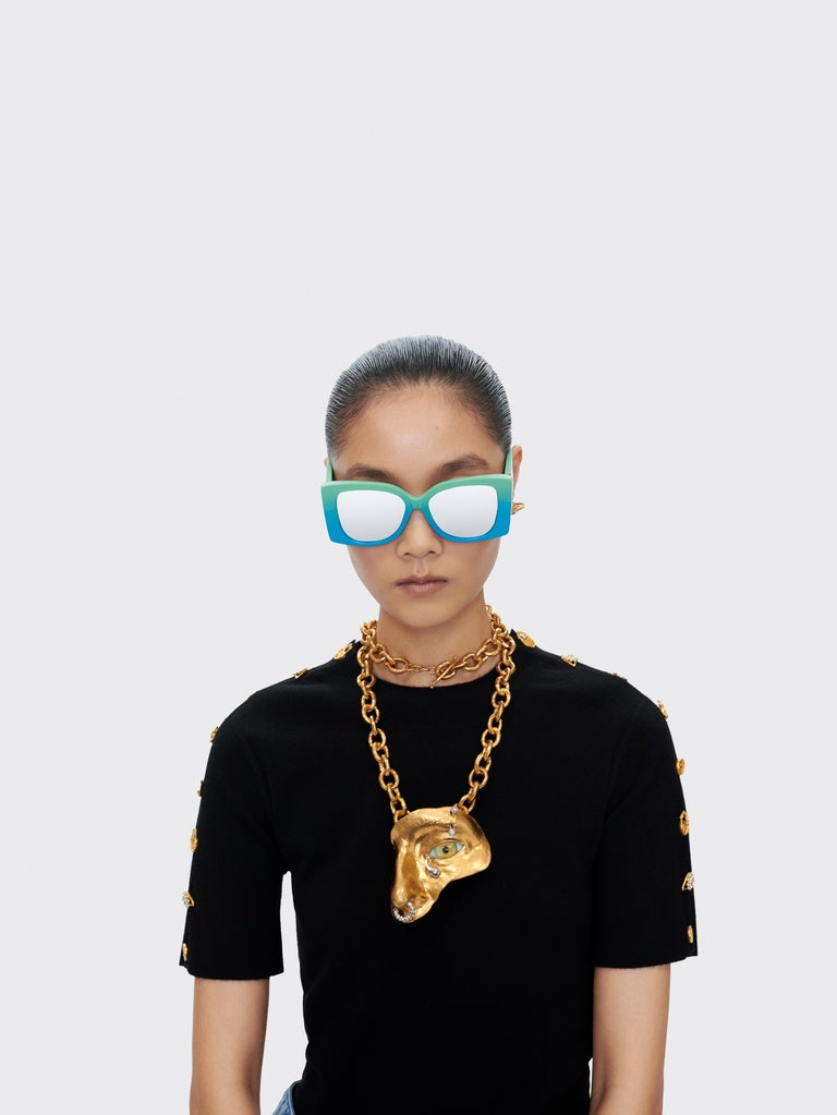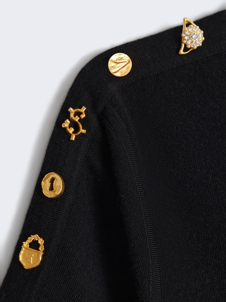This fitted, short-sleeved, crew-neck sweater in black cashmere is enhanced with signature hammered gold brass jewel buttons at the shoulders.