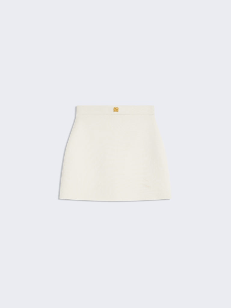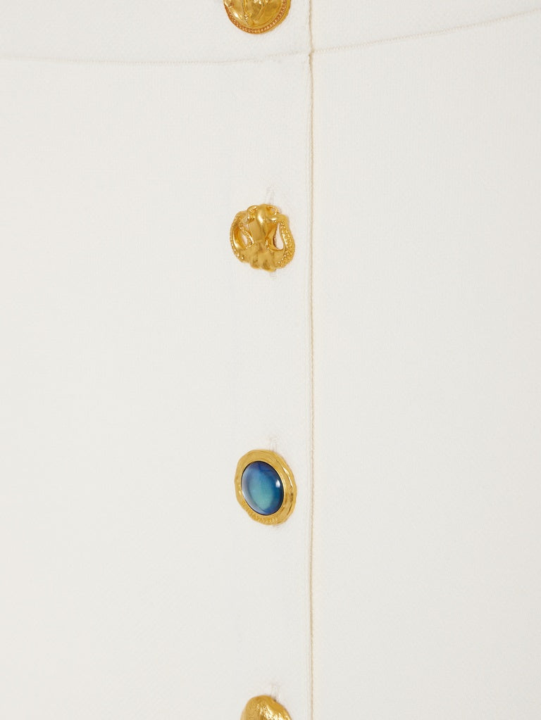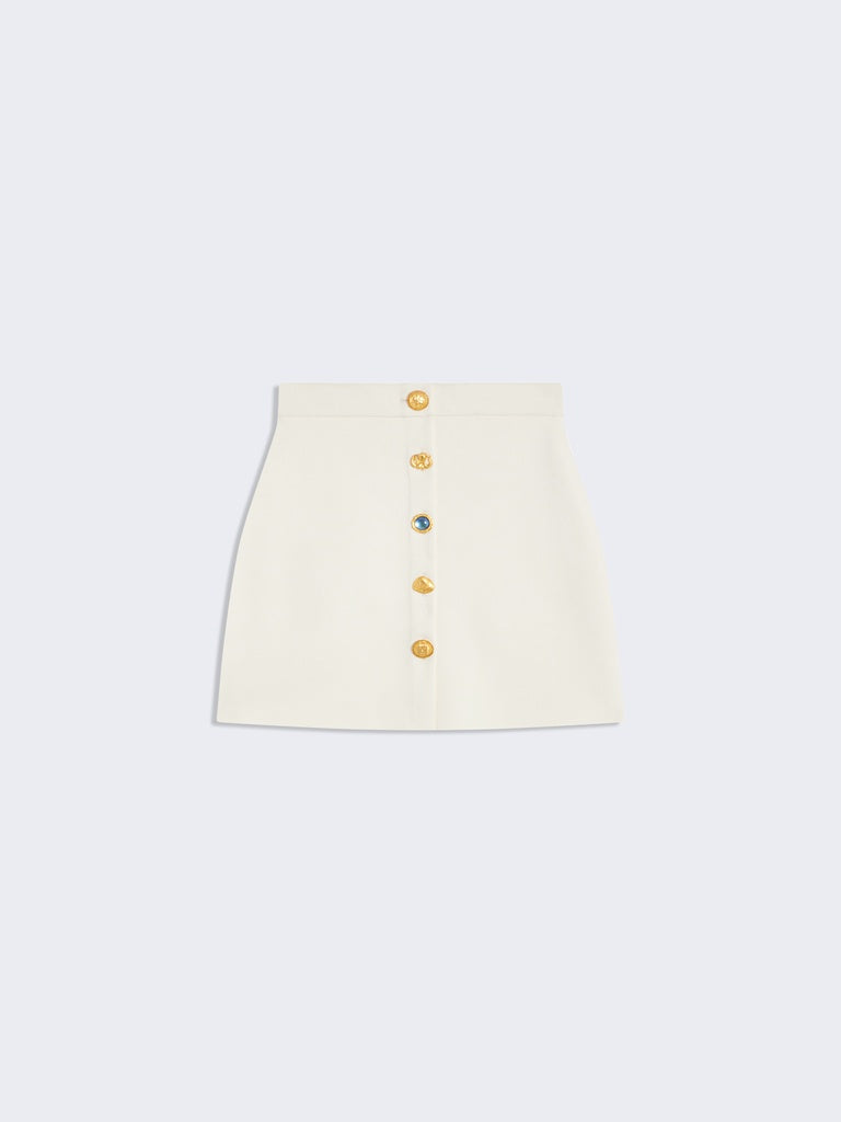 This close-fitting miniskirt in ecru piqué viscose knit is adorned with hammered gold brass jewel buttons all over the center front.