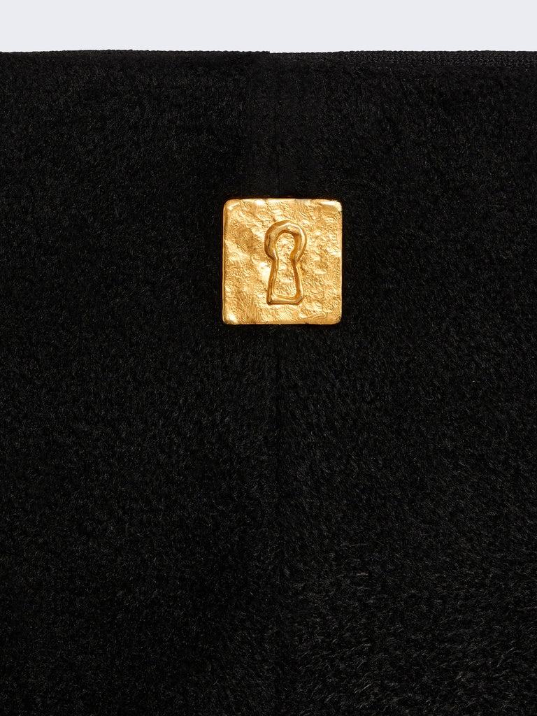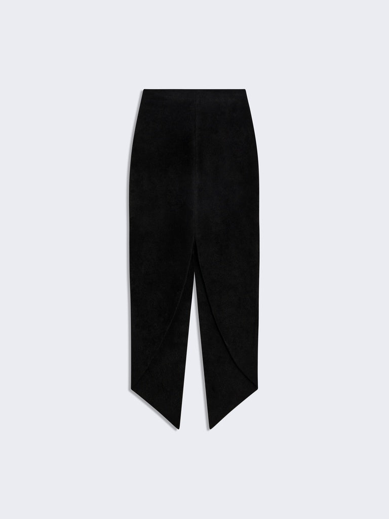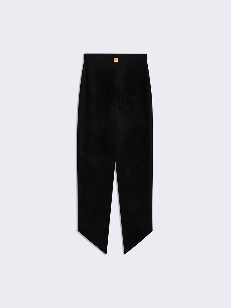 This black viscose knit pencil skirt with a velvety effect falls to mid-calf. It features a rounded hem and a back slit.