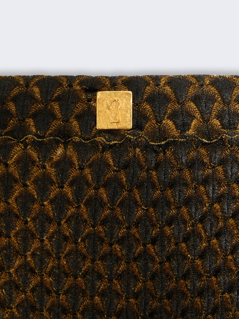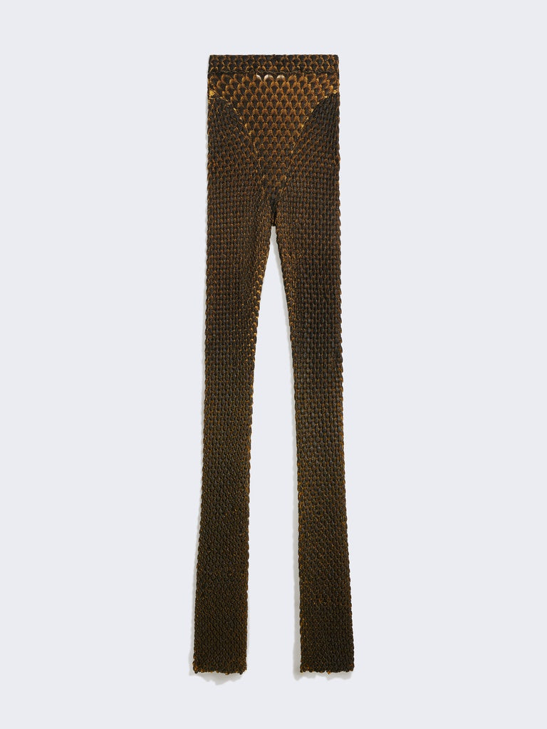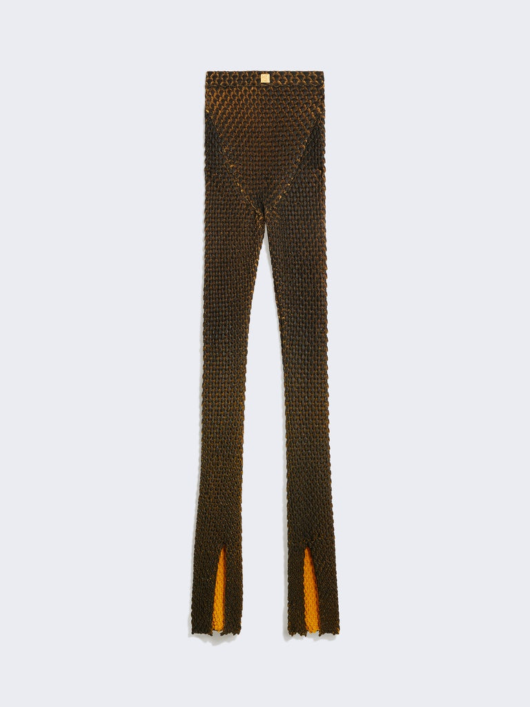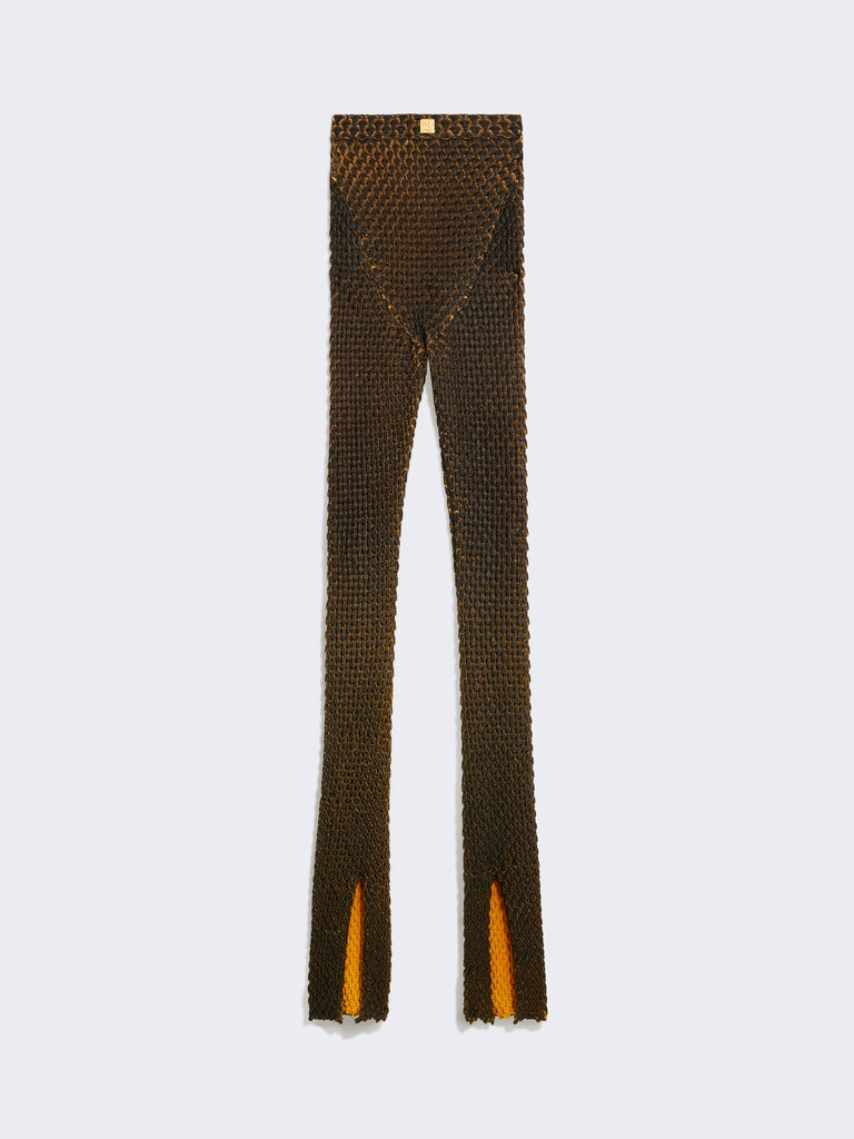 These bootcut trousers are knitted in yellow laminated with a black "snake scale" effect. They are enhanced with a very narrow leg, split at the bottom, and a signature keyhole rivet at the back.
