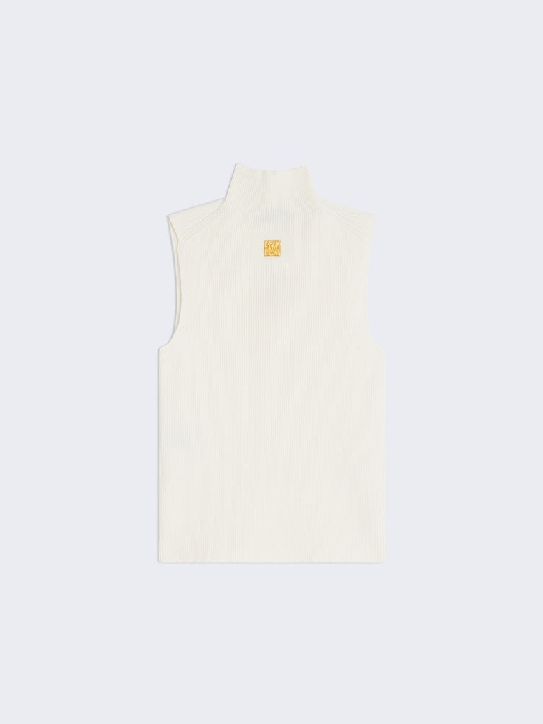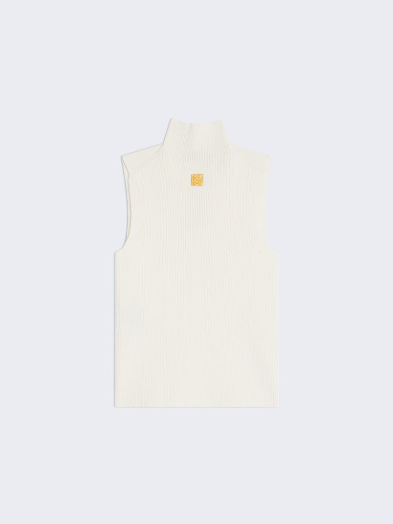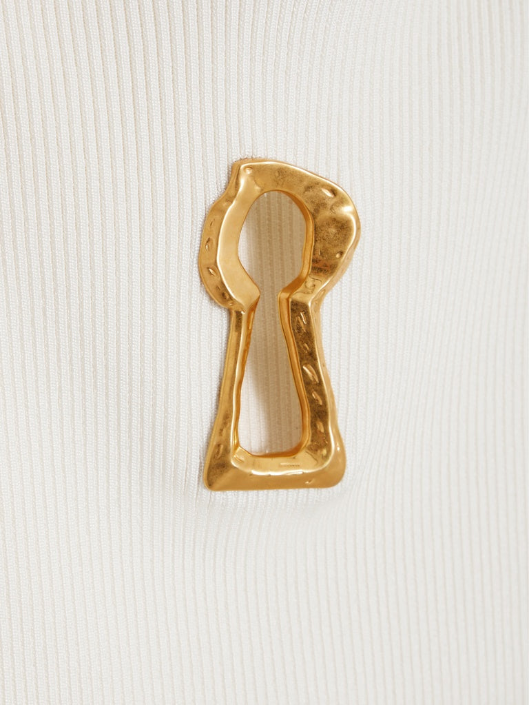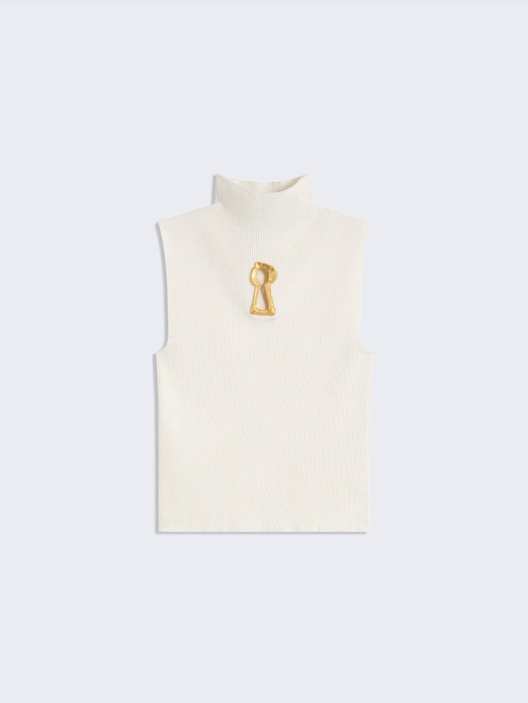 This sleeveless turtleneck sweater is made from ecru ribbed viscose knit. It is embellished with a signature keyhole detail on the front in gold-tone metal.