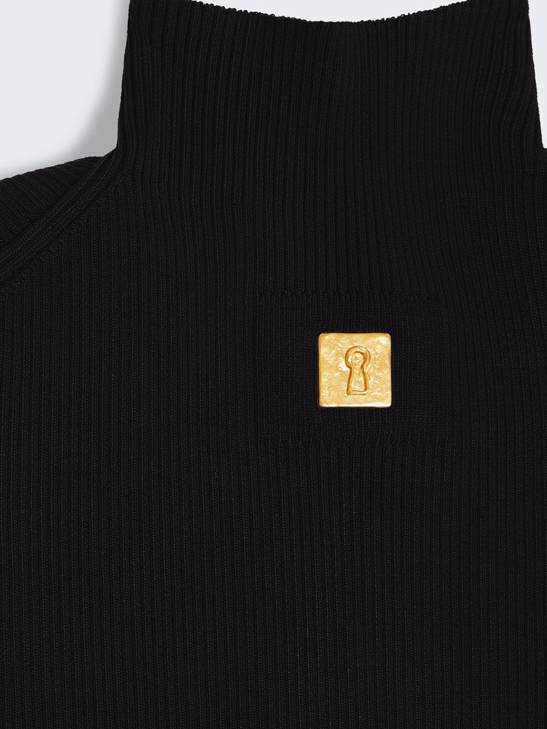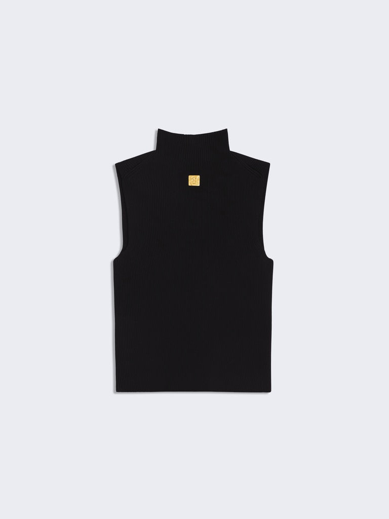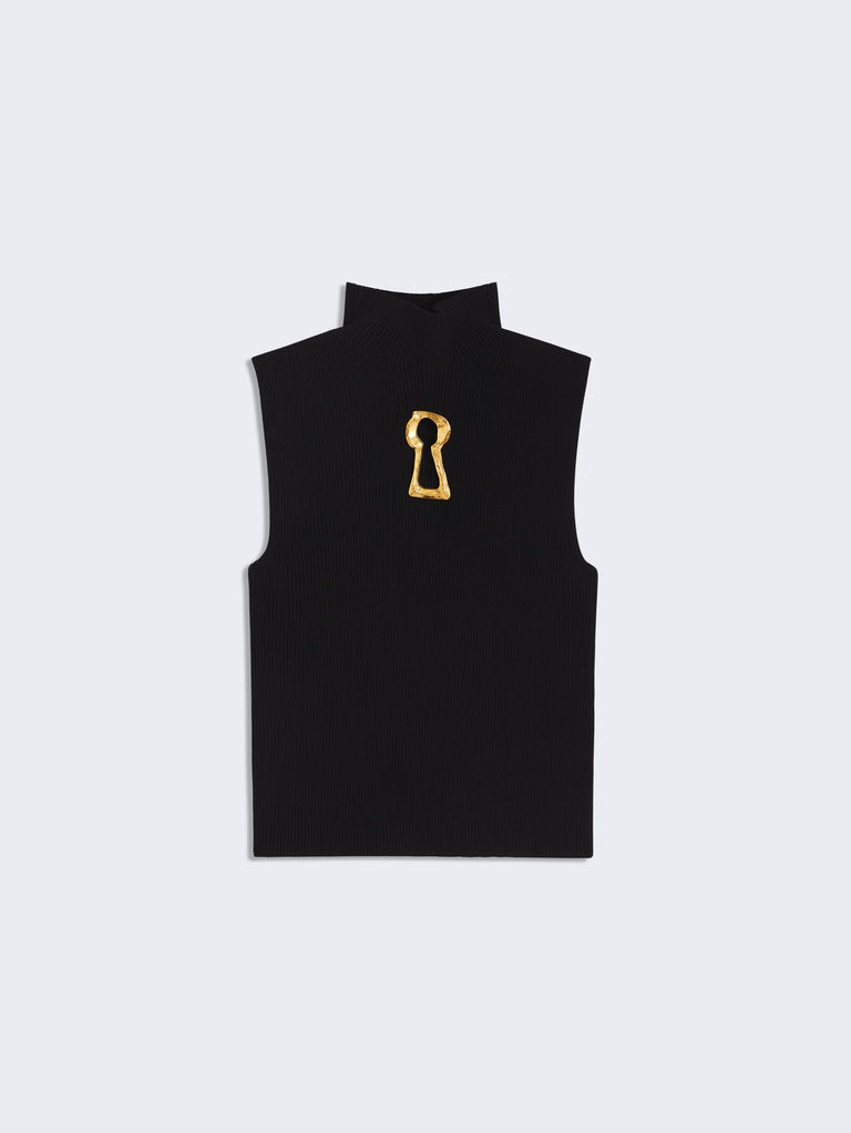 This sleeveless turtleneck sweater is made from black ribbed viscose knit. It features a signature keyhole detail on the front.