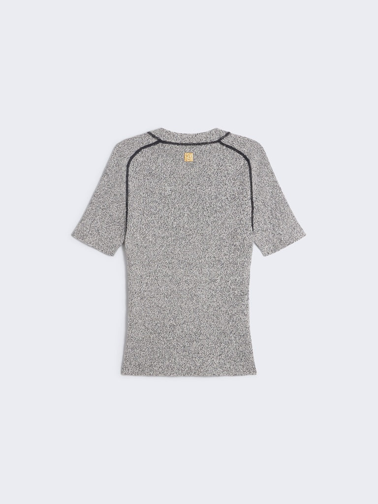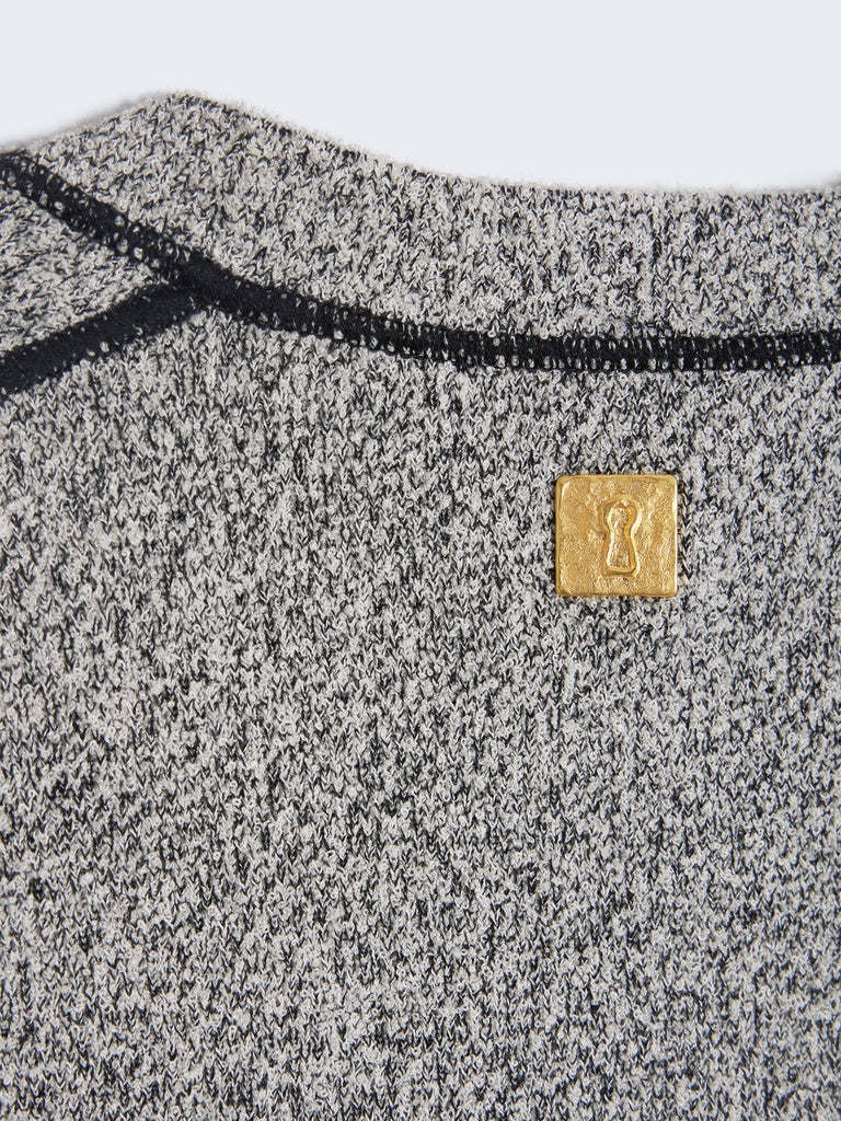 This short-sleeved, fitted raglan sweater is crafted from a grey knit with a covered stitch that gives the fabric a textured effect. It is finished with a signature keyhole rivet at the back.