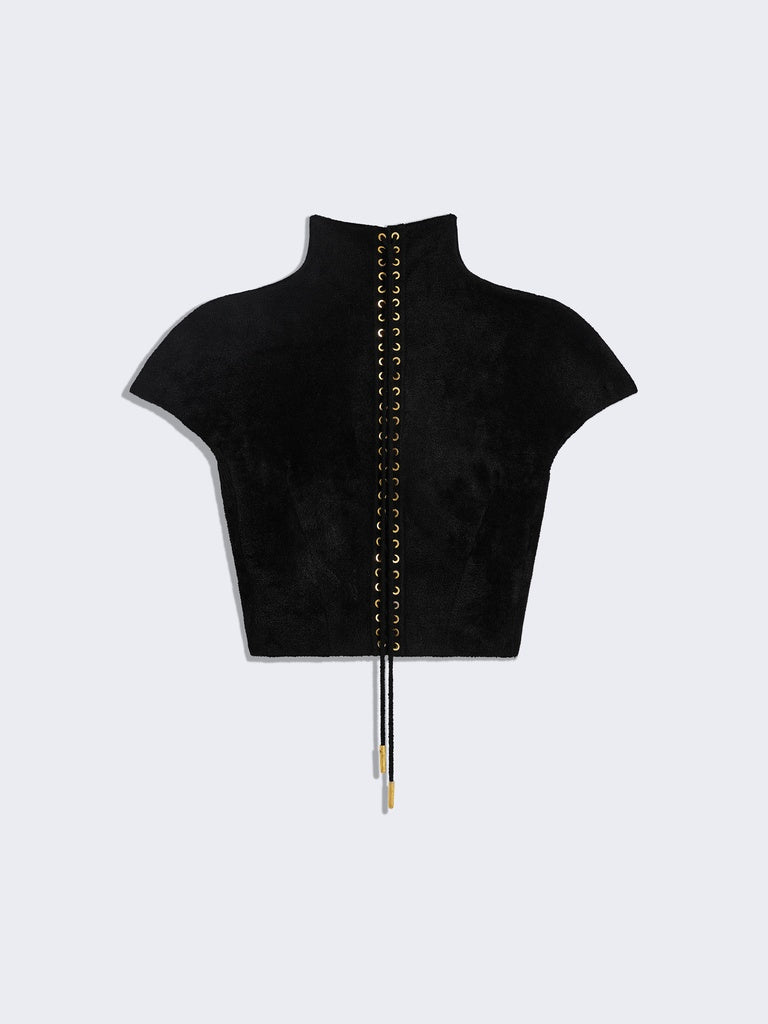 This hooded sweater with a funnel neck is knitted in black viscose with a velvety effect. It is embellished with a bone-length lacing detail and gold-tone metal eyelets at the back.